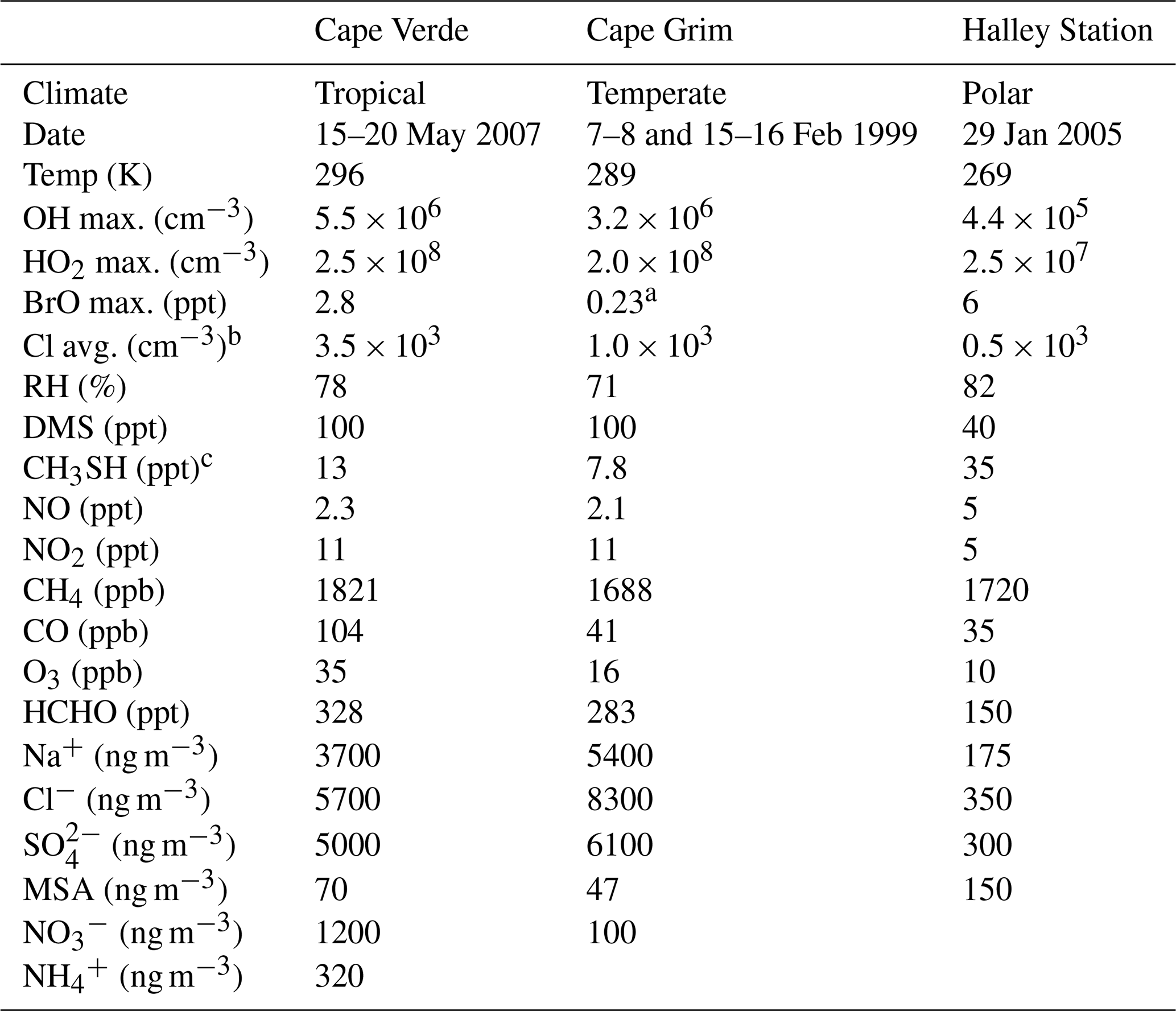 Table 1A summary of the conditions in Cape Verde, Cape Grim, and Halley Station box model runs which, unless specified, are fieldwork daily averages over the chosen days (Natural Environment Research Council et al., 2006; Allan et al., 1987; Natural Environment Research Council et al., 2005). For the Cape Grim data, the gas-phase concentrations are daytime averages (11:00 a.m.–02:00 p.m. AEDT), and the aerosol concentrations are averages of measurements taken in February 1989 and 1990 from a different Cape Grim campaign (Andreae et al., 1999).