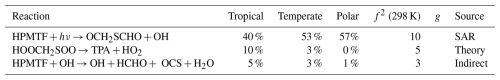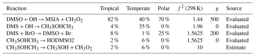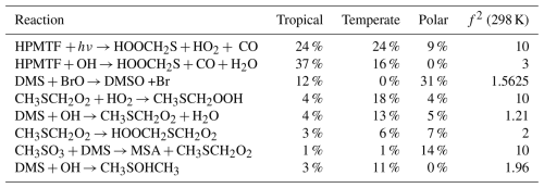 The contribution to uncertainty from direct measurements is smaller than the contribution from indirect experiments, with the exception of HPMTF and SO2 in the polar regime. In the polar regime, the primary contribution from an indirect experiment is the uncertainty from the reaction of CH3SH and BrO for SO2 (contributing 82 %, f2(T)=10), and the isomerisation of CH3SCH2O2 for HPMTF (contributing 7 %, f2(T)=2).