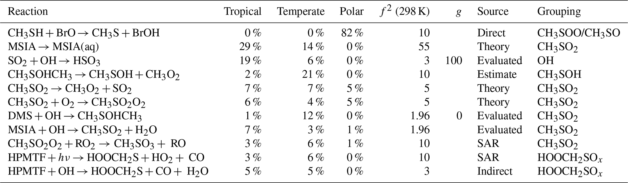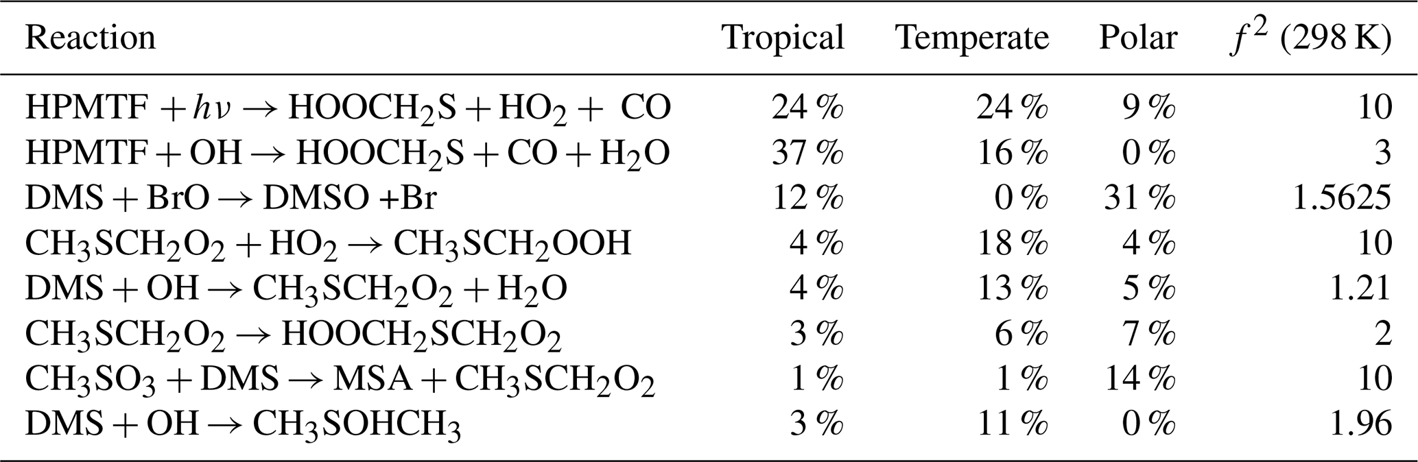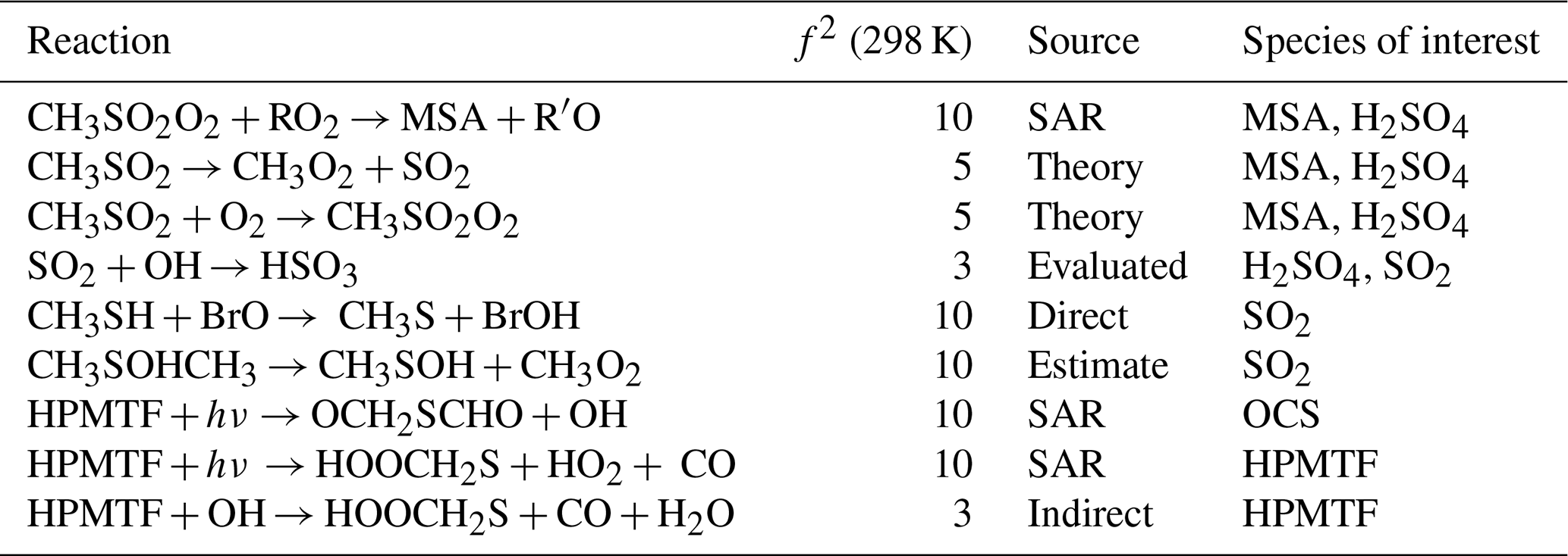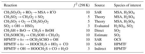 Table 4Gas-phase reactions identified as the largest overall contributors to the uncertainty of MSA, H2SO4, SO2, OCS, and HPMTF. The uncertainty factors at 298 K (f2), the sources of the rate constants, and the species that are affected by the reactions are also included. In these reactions O2 has not been conserved, and has been added to radicals when their reaction with O2 is fast.