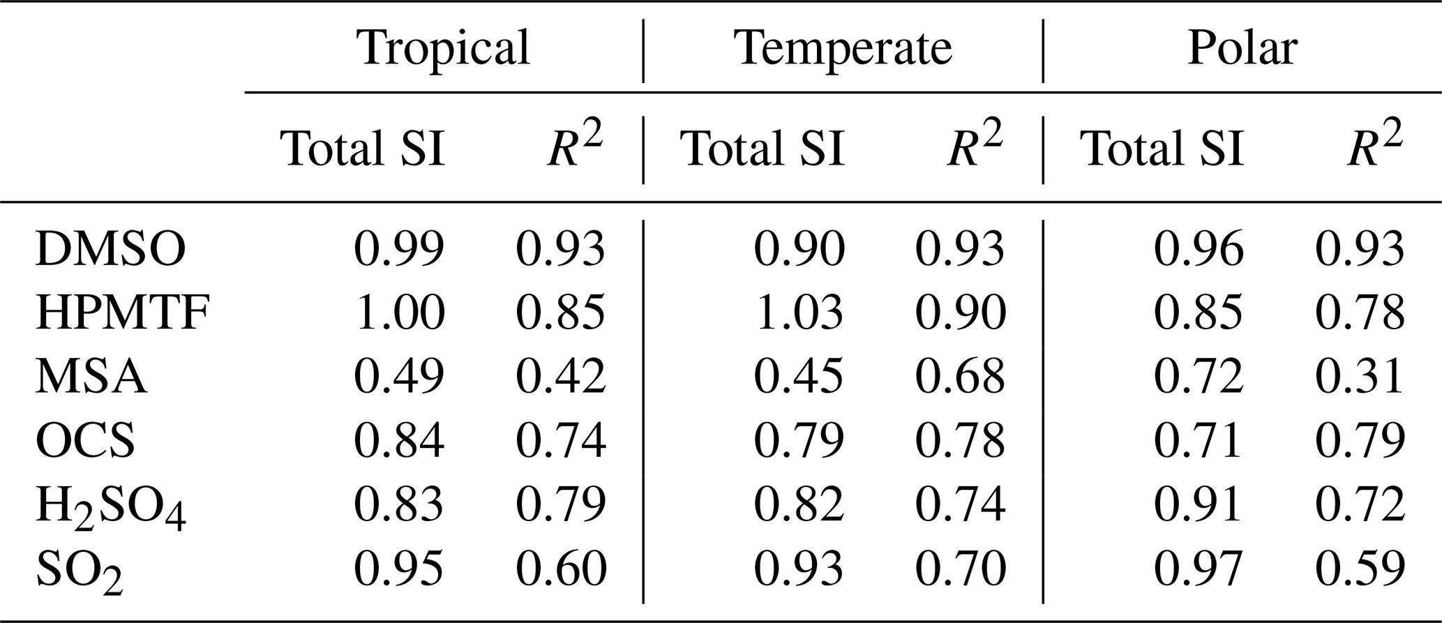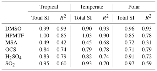 The total SI is above 80 % for DMSO, HPMTF, H2SO4, and SO2, however, it is as low as 45 % for MSA in the temperate regime; consequently, only 45 % of the uncertainty in MSA in that regime can be attributed to specific reactions from the DMS oxidation mechanism in this study. A low total SI is usually due to a nonlinear relationship, resulting in more contributions from the interactions between reactions. The nonlinearity was explored by analysing the simulation results with a multiple linear regression model which also measured the contribution of each reaction to the uncertainty in the concentration of the sulfur species at midday, based on Rodriguez and Dabdub (2003). The resultant R2 values are given in Table 3. In three cases (MSA and DMSO in the temperate regime, and OCS in the polar regime), the R2 value was higher than the total SI calculated. Otherwise, the total SI was larger than the R2 value, which demonstrates that the lower total sensitivity indices are due to nonlinearities. Second-order sensitivity indices would provide more information on the contribution of specific reactions to the uncertainty, however, a full Sobol sensitivity analysis, which would provide second-order sensitivity indices, is unfeasible, with over 160 parameters (reactions/processes) being explored (Stein et al., 2022).