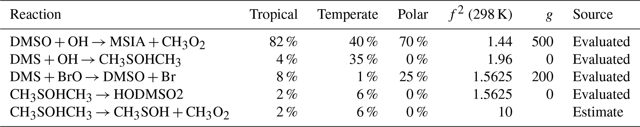 The uncertainty of DMSO concentration, which was an average of ±25 %–49 % in the regimes, is primarily due to reactions that have been evaluated (84 %–98 %). Three reactions that have been evaluated by the Burkholder et al. (2019) NASA panel report contribute the most to the uncertainty in DMSO concentration: the reaction of DMSO with OH radicals (contributing 40 %–82 %, f2(T)= 1.47–2.07), the reaction of DMS with BrO (contributing 8 %–25 % in the tropical and polar regimes, f2(T)= 1.58–1.81), and the addition reaction of OH with DMS (contributing 35 % in the temperate regime, f2(T)=1.96).