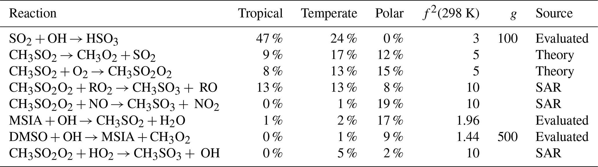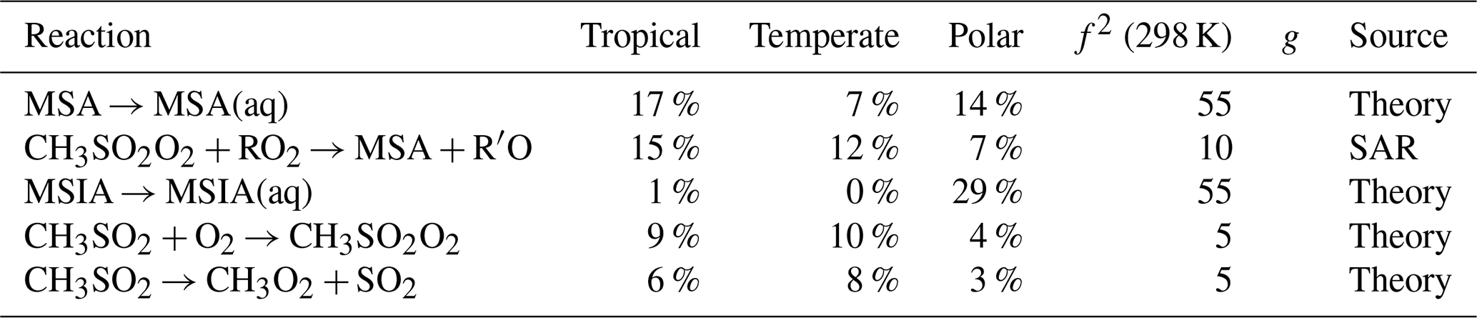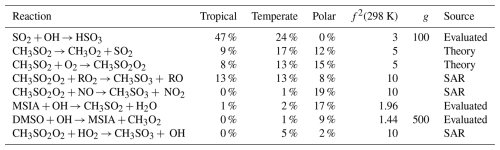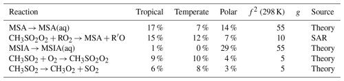 Rate constants arising from theory contribute the most to the uncertainty of MSA (26 %–51 %), and SO2 in the temperate and tropical regimes (27 % and 42 %, respectively). For both species, this is due to the decomposition of CH3SO2 forming SO2 (f2(T)=5), and the reversible addition of oxygen to CH3SO2 (f2(T)=5), along with the uncertainty in Henry's law constant for MSIA (f2(T)=55). Note that the larger uncertainty factors for Henry's law constants reflect the assigned uncertainties in the NASA panel report (see Sect. S10 and Table S1 for more information). Additionally, the Henry's law constant for MSA contributes 7 %–17 % of the uncertainty in the concentration of MSA (f2(T)=55).