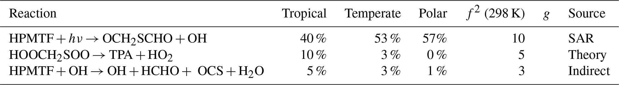 Although the reactions of HOOCH2SO and HOOCH2SOO have not been studied experimentally or computationally, their rate constants in this work use structure-activity relationships based on the reactions of CH3SO and CH3SOO, respectively. The HOOCH2SO reaction with O3 and the isomerisation of HOOCH2SOO (and subsequent decomposition) forming SO2 have been grouped as HOOCH3SOx. HOOCH2SO and HOOCH2SOO both arise from reactions of HOOCH2S, which forms from the photolysis of HPMTF, and the reaction of OH with HPMTF.