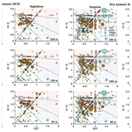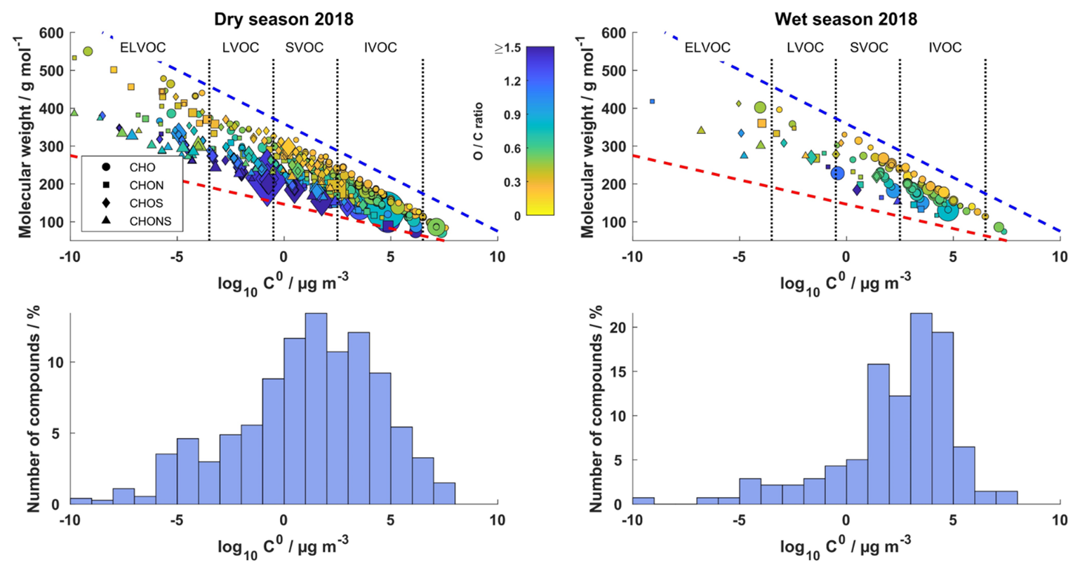 Highly unsaturated organic compounds: Area V is predominantly composed of highly unsaturated organic compounds that are combustion-related (Zhang et al., 2021). The number of compounds and the variety of species is enhanced for the dry season 2018 compared to the wet season 2018. This trend is also reflected in the BBOA areas in Fig. 4. Furthermore, black carbon equivalent concentrations (BCe) were enhanced during the dry season 2018 compared to the wet season 2018 (Fig. S17). No single dominant species was identified among the combustion-related highly unsaturated organic compounds, as their composition varied substantially between seasons. While the wet season 2018 shows mainly CHO species with a decreased number of compounds during nighttime, the dry season 2018 is dominated by CHOS and CHONS species and an increased number of CHON compounds during nighttime, suggesting enhanced particle-phase partitioning at lower temperatures.