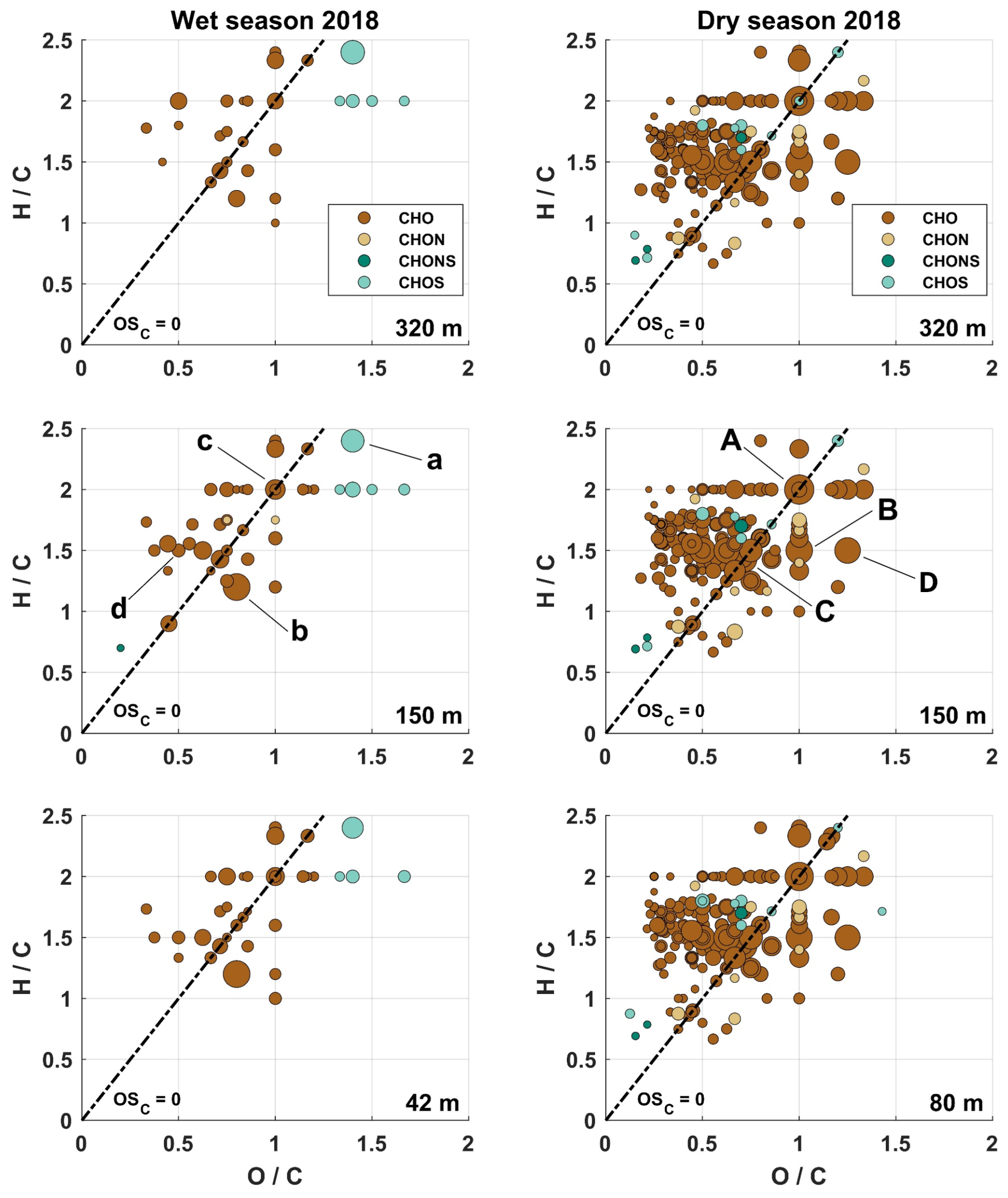 Van Krevelen diagrams (VK diagrams) are used to visualize similarities and differences, e.g. between measuring locations, measuring heights, daily or seasonal influences. In a VK diagram, the H C ratio is shown as a function of the O C ratio for each molecular formula detected in a sample. This helps for example to visualize the degree of oxidation of the particle phase organics as the most oxidized molecules are located at the lower right corner (Zhang et al., 2021). Consequently, the most saturated and reduced species are found in the upper left region. VK diagrams of the wet and dry season 2018 at different sampling heights are shown in Fig. 1. The corresponding VK diagrams for the wet and dry season 2019 show very similar patterns and can be found in Fig. S9. The signal intensity is proportional to the size of the symbols. However, the signal intensities of the various compounds certainly only provide semi-quantitative results and should therefore only be converted into concentrations to a limited extent, as different substances are detected with different sensitivities due to the selectivity of the electrospray ionization with regard to ion yield. The most intense ion signals are summarized in Table 2 with their molecular formula, their possible identity and the precursor species.