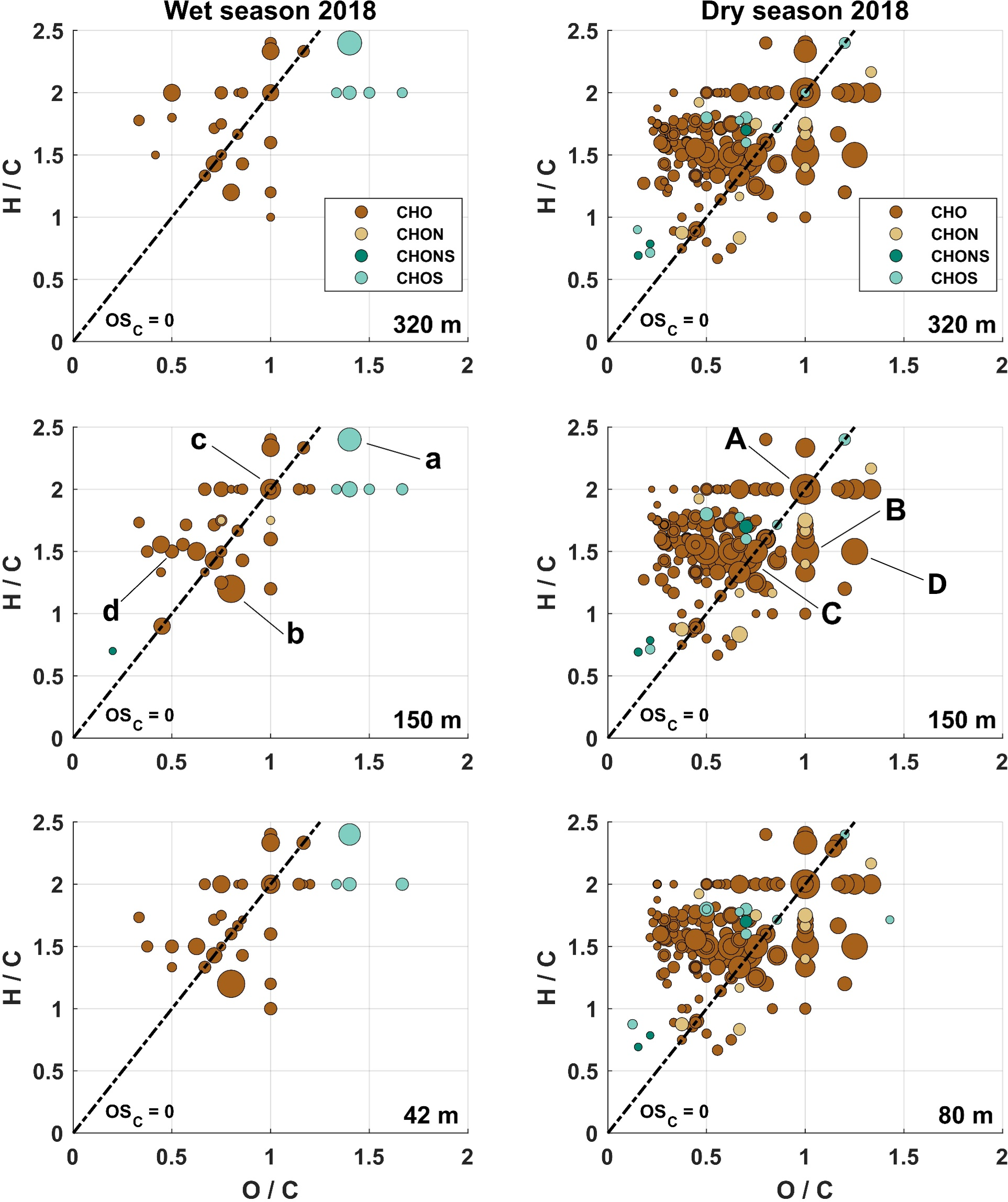 Figure 1Van Krevelen plots from the wet season 2018 (left panel; sampling heights: 320, 150, 42 m) and the dry season 2018 (right panel; sampling heights: 320, 150, 80 m). Included are only molecular formulae that were present in more than 75 % of the samples, respectively. The size of the data points represents the signal intensity of the corresponding peak. The four subgroups are distinguished with different colors. Compounds located on the black dashed line have an average carbon oxidation state of 0 (OSC = 0). The labels a–d and A–D correspond to the most intense signals further characterized in Table 2.