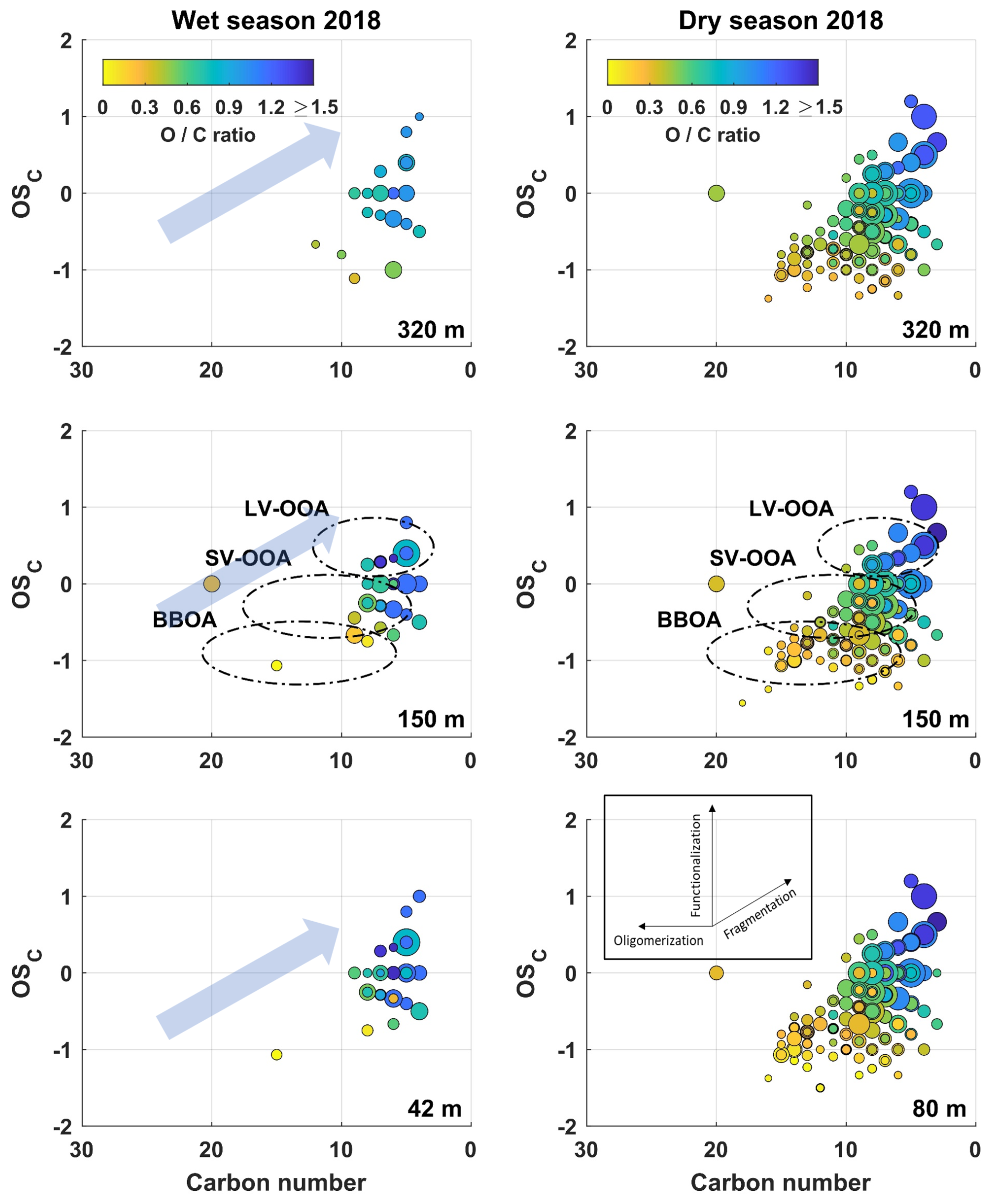 Figure 2Carbon oxidation state (OSC) plots for all detected CHO species during the wet season 2018 (left) and dry season 2018 (right) at different sampling heights. Only background ions are included. The size of the data points represents the signal intensity of the corresponding peak. The color code illustrates the degree of oxygenation. The black dashed areas are related to low-volatility (LV-OOA) and semivolatile (SV-OOA) oxygenated organic aerosol and biomass-burning organic aerosol (BBOA). Insets: vectors corresponding to key classes of reactions of atmospheric organics: functionalization (addition of polar functional groups), fragmentation (cleavage of C–C bonds), and oligomerization (covalent association of two organic species). The combination of these reaction types leads to complex movement through (the OSC–carbon number) space; however, the inevitable increase in OSC with atmospheric oxidation implies that, given enough time, organics will generally move up and to the right (blue arrows). Insets based on Kroll et al. (2011).