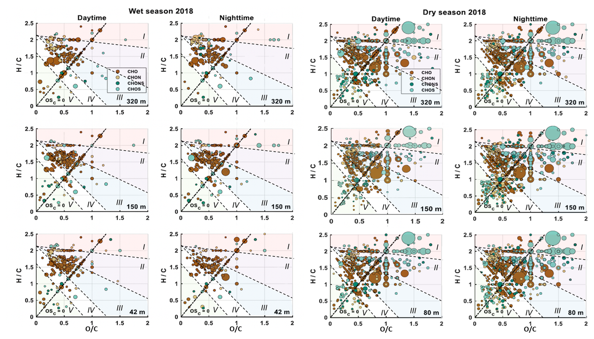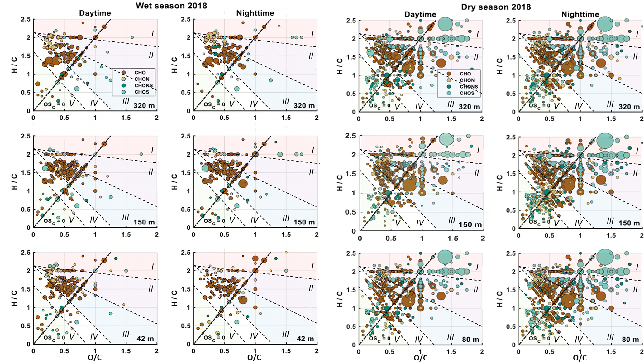 Figure 3Van Krevelen plots from the wet season 2018 (left panel) and dry season 2018 (right panel) during daytime and nighttime at 42, 150, 320 m height and 320 m height and dry season 2018 (right panel) during daytime and nighttime at 80, 150, and 320 m height. Included are only molecular formulae that were present in more than one of the samples, respectively. The background signals are subtracted. The size of the data points represents the signal intensity of the corresponding peak. The four subgroups CHO, CHON, CHONS and CHOS are distinguished with different colors. Compounds located on the black dashed line have an average carbon oxidation state of 0 (OSC = 0). The VK diagram was divided into five areas: I for very highly oxidized organic compounds, II for highly oxidized compounds, III for intermediately oxidized compounds, IV for oxidized unsaturated organic compounds and V for highly unsaturated organic compounds. The five areas were defined according to Zhang et al., 2021. Area (I) is mainly characterized by CHOS molecules with at least one sulfate functional group and C4 and C5 backbones. Area (II) is dominated by highly oxidized compounds representing aged OA and biomass burning products. Area (III) shows mainly aliphatic species. Area (IV) is dominated by unsaturated hydrocarbons with low oxygen content and aromatic structures while area (V) shows mainly combustion related species.
