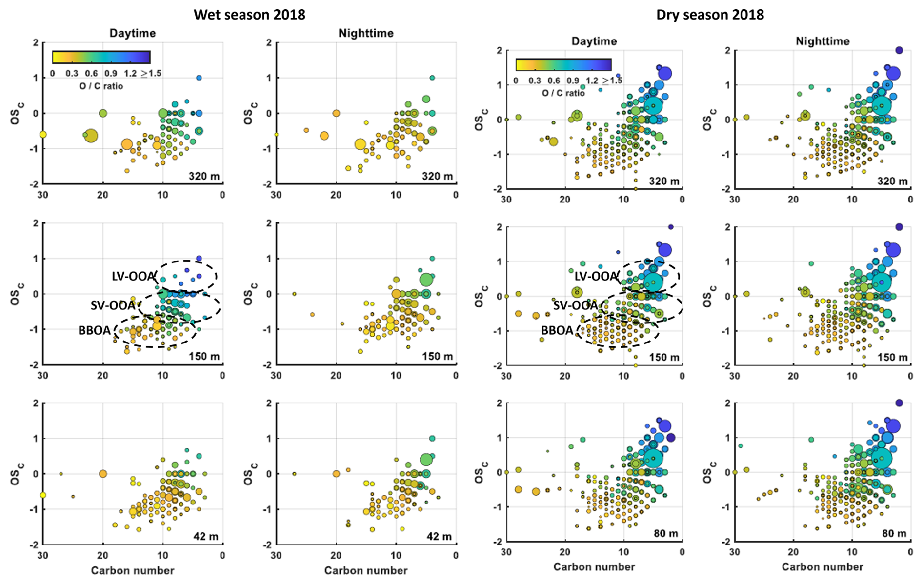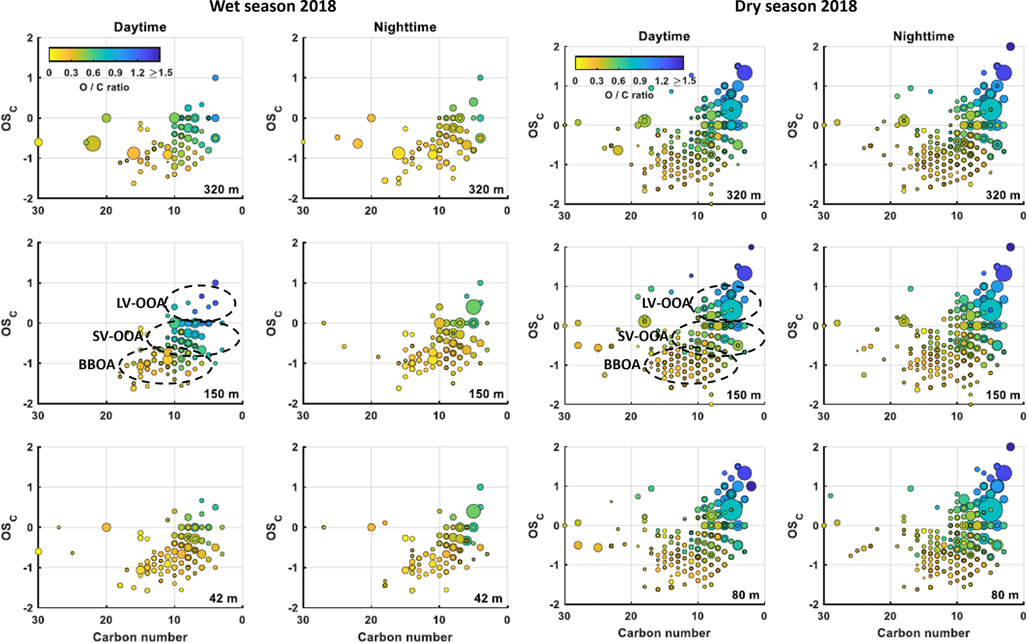 Figure 4Carbon oxidation state (OSC) plots for all detected CHO species during the wet season 2018 at daytime and night time at 42, 150, 320 m and dry season 2018 (right) at daytime and nighttime at 80, 150 and 320 m sampling height. Included are only molecular formulae that were present in more than one of the samples, respectively. The background signals are subtracted. The size of the data points represents the signal intensity of the corresponding peak. The color code illustrates the degree of oxygenation. The black dashed areas are related to low- volatility (LV-OOA), semivolatile (SV-OOA) oxygenated organic aerosol and biomass burning organic aerosol (BBOA).