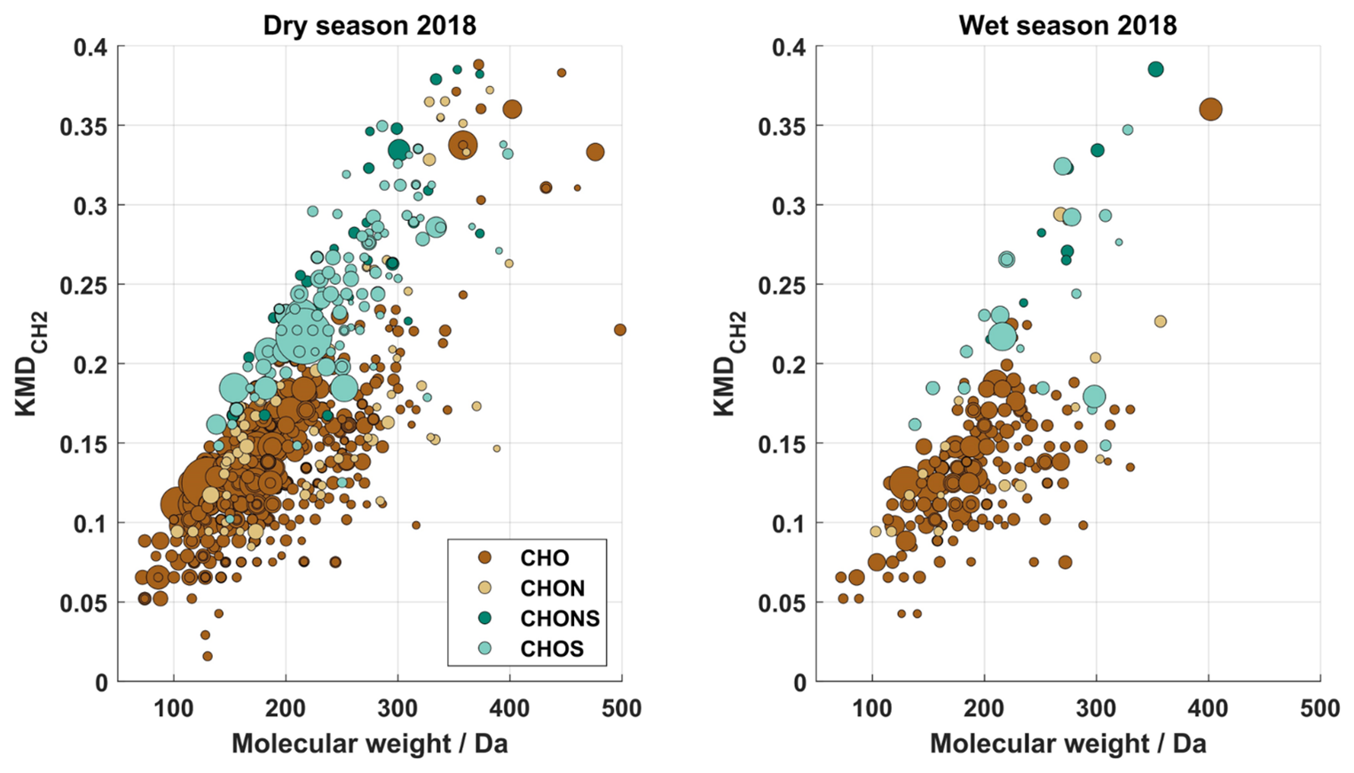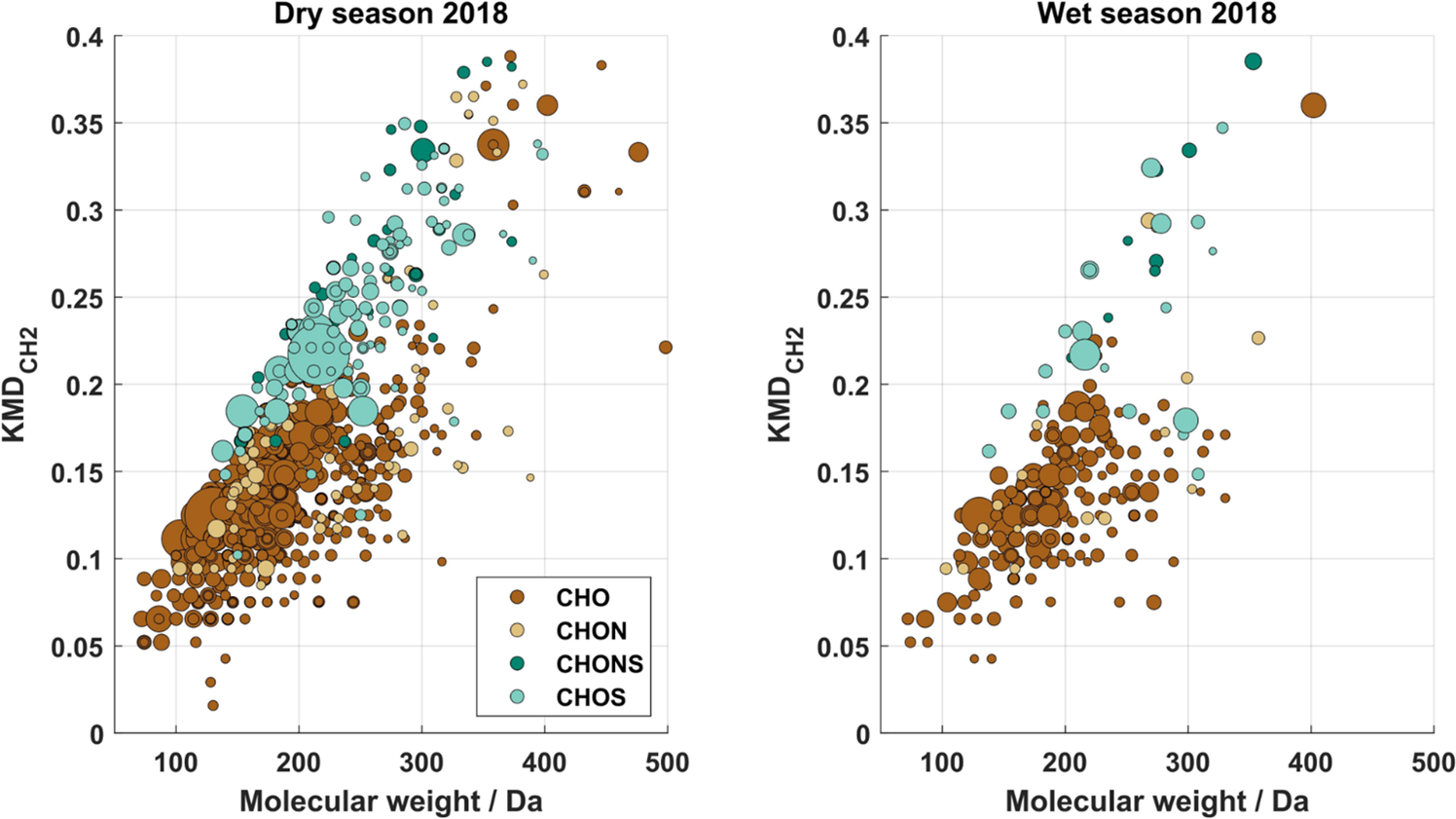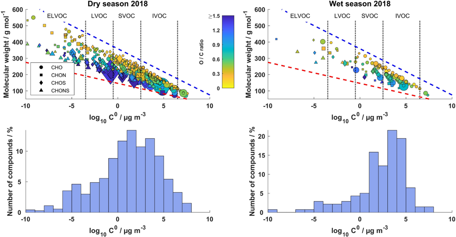All filter samples reveal a high chemical diversity with 875–1940 unambiguously assigned molecular formulae with a large fraction of isomeric compounds (69 %–85 %) (Table 1), highlighting the importance of pre-separating the samples by HPLC. The identified molecular formulae were divided into four subgroups according to their elemental composition: CHO, CHON, CHONS, and CHOS. The CHO subgroup is predominant with (56 ± 6) % in all samples, followed by CHON with (20 ± 7) %, CHOS (17 ± 5) %, and CHONS (7 ± 1) %, although the contribution of sulfur- and/or nitrogen-containing compounds increases at higher MWs. This trend is in good agreement with similar studies from remote environments (e.g. Amazonia, Brazil: CHO(−) with 58 %–63 %, CHON(−) with 25 %–30 %, CHOS(−) with 10 %, CHONS(−) with 2 %, Kourtchev et al., 2016; Hyytiälä, Finland: CHO(−) with 54.8 ± 2.2 %, CHON(−) with 21 ± 3 %, CHOS(−) with 16 ± 3 %, CHONS(−) with 5.4 ± 2.2 %, Kourtchev et al., 2013), while studies from a suburban and urban environment revealed enhanced contributions of CHON and CHONS compounds (Pearl River Delta region, China: CHON(−) with 34 %, CHONS(−) with 8 %, Lin et al., 2012; Cambridge, UK: CHON(−) with 33 %, CHONS(−) with 21 %–26 %, Rincón et al., 2012; Shanghai, China: CHON(−) with 21 %–23.7 %, CHONS (−) with 11.2 %–16.6 % , Wang et al., 2017), proving an increased relevance of nitrogen and sulfur chemistry in more polluted areas. The total calculated elemental ratios are highly variable throughout the seasonal measurement campaigns with 0.60 ± 0.37 (mean value ± standard deviation of the data set) and 1.47 ± 0.49 for O C and H C during the dry season and 0.49 ± 0.32 and 1.56 ± 0.45 during the wet season, respectively. The wide variability indicates a high chemical complexity within the data set. Comparable values were reported from the boreal forest in Hyytiälä, Finland (0.58 and 1.54 for O C and H C, respectively) (Kourtchev et al., 2013). Additionally, the elemental ratios obtained in this study are consistent with smog chamber experiments using certain biogenic VOCs for SOA generation, e.g. α-pinene (0.42–0.55 for O C and 1.5 for H C, Putman et al., 2012) and limonene (0.5–0.6 for O C and 1.5–1.6 for H C, Kundu et al., 2012). Vertical profiles of α-pinene and limonene were measured at ATTO showing different chemical speciations between day and night (Zannoni et al., 2020; Yáñez-Serrano et al., 2018). The averaged total oxidation states of CHO compounds in the wet seasons (−0.681 ≤ OSC ≤ −0.486) are lower than in the dry seasons (−0.525 ≤ OSC ≤ −0.324) indicating more processed organic aerosol in the dry seasons than in the wet seasons. Furthermore, the averaged total aromaticity indices (Xc ≤ 2.50) do not suggest a significant portion of mono- or polycyclic hydrocarbons.