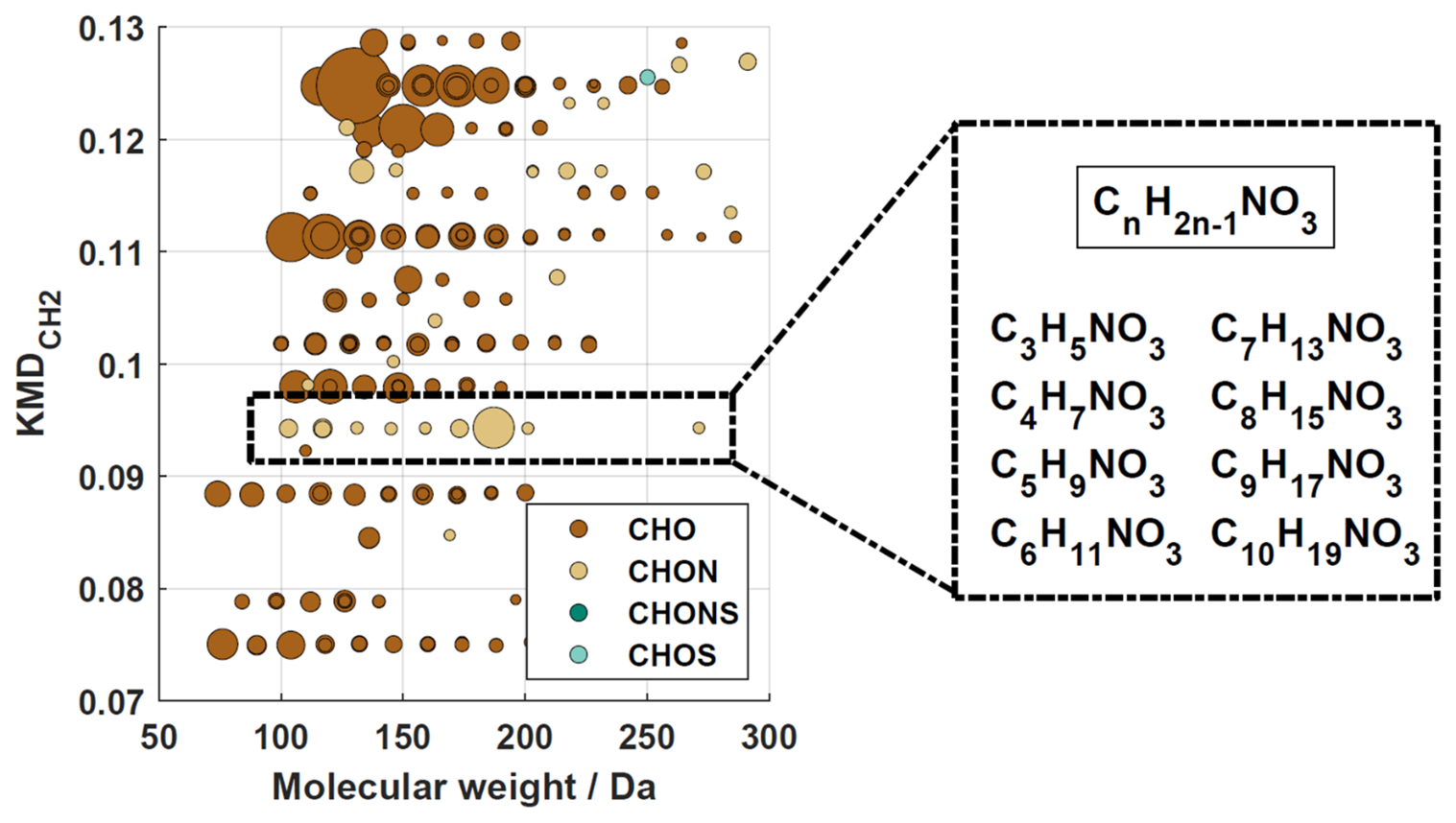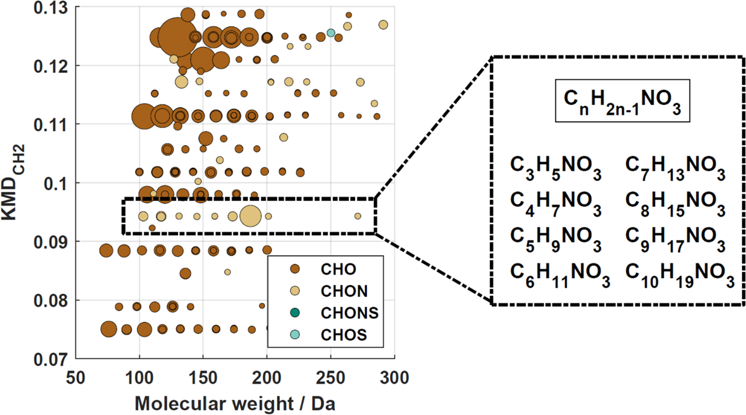 where nominal KM describes the KM rounded to the next integer. Consequently, compounds differing only in their number of CH2 units have the same KMD values. Homologous series can be identified as horizontal lines in KMD plots.