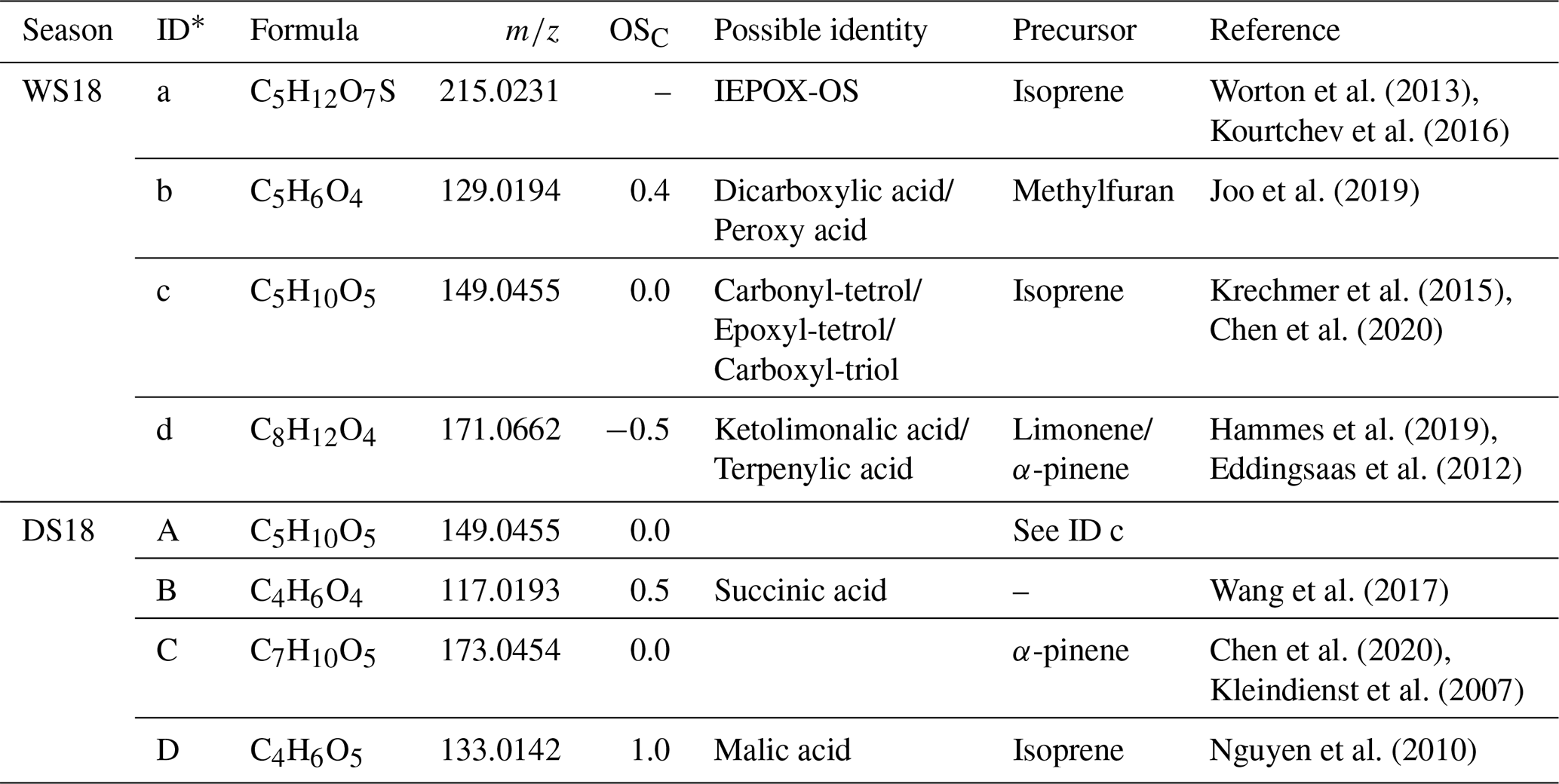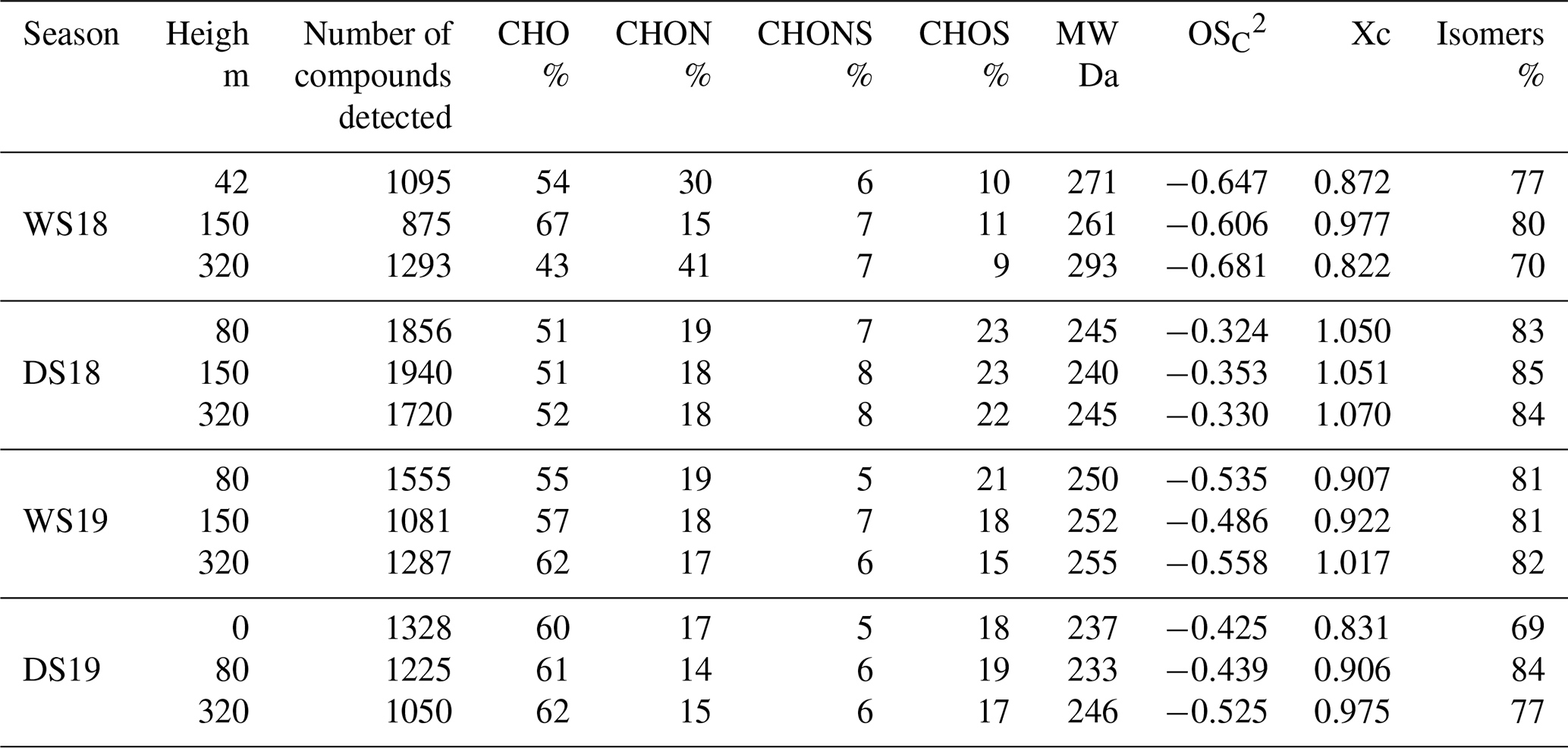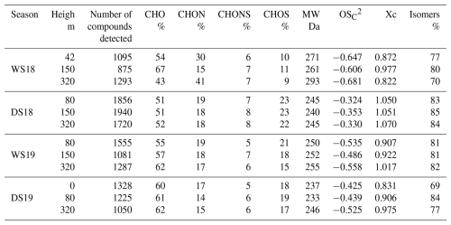 Table 1Summary of all observed MS signals with unambiguous molecular formula assignment for the four measurement campaigns in 2018 and 2019 (wet season = WS, dry season = DS). The signals are divided into four subgroups regarding their elemental composition. The relative contribution of the subgroups was calculated by dividing the number of compounds of the particular subgroup by the total number of compounds. Additionally, the average values1 of molecular weight (MW), carbon oxidation state (OSC), aromaticity index (Xc), and isomeric fraction are listed.