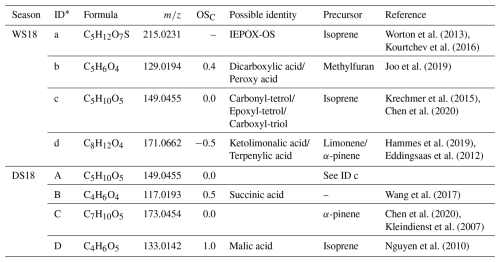 Intermediately oxidized organic compounds: Area III mostly consists of first-generation oxidation products of monoterpenes and sesquiterpenes that are intermediately oxidized (Zhang et al., 2021). Again, the dry season 2018 is characterized by a higher number and concentration of compounds than the wet season 2018 while no significant differences are observed between the daytime and nighttime samples. The compounds are characterized by aliphatic species that can be attributed to mixed anthropogenic and biogenic sources (Henze et al., 2008; Kourtchev et al., 2013). A prominent ion was observed at 185.0819, which was assigned to the molecular formula C9H14O4. The compounds with this molecular formula showed multiple signals in the LC-MS analysis, indicating the presence of several isomeric structures. One signal was identified as pinic acid (PA) from an authentic standard compound (Table S5). The additional signals are likely to be oxidation products of other monoterpenes, such as β-pinene, limonene and Δ3-carene (Jenkin, 2004; Chen and Griffin, 2005; Hammes et al., 2019). In contrast to MBTCA, pinic acid is an oxidation product that is already formed during the first oxidation steps of α-pinene and can therefore be used as a tracer for freshly formed SOA. Later generation products, such as MBTCA, were more concentrated in the dry seasons, indicating more processed SOA particles, while PA was predominant in the wet periods. The OSC analysis in Fig. 4 shows that the dry season 2018 has pronounced signals at small numbers of C atoms with high O C ratios, whereas the wet season 2018 is characterized by pronounced SV-OOA species, supporting the different seasonal variation of different generations.