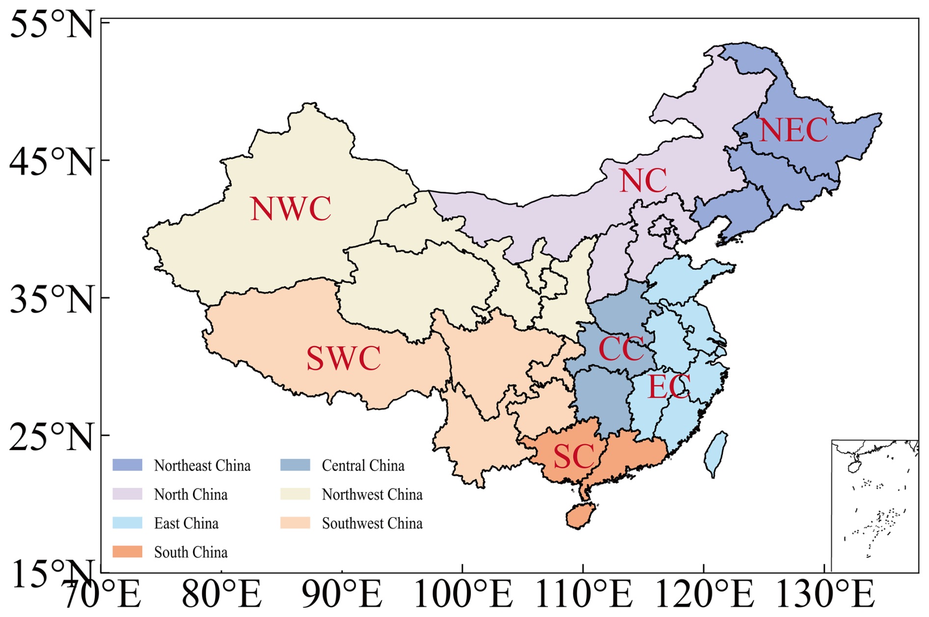 Figure 1Geographic locations of China and its seven sub-regions used in this study (Northeast China (NEC), North China (NC), East China (EC), South China (SC), Central China (CC), Northwest China (NWC), and Southwest China (SWC)).