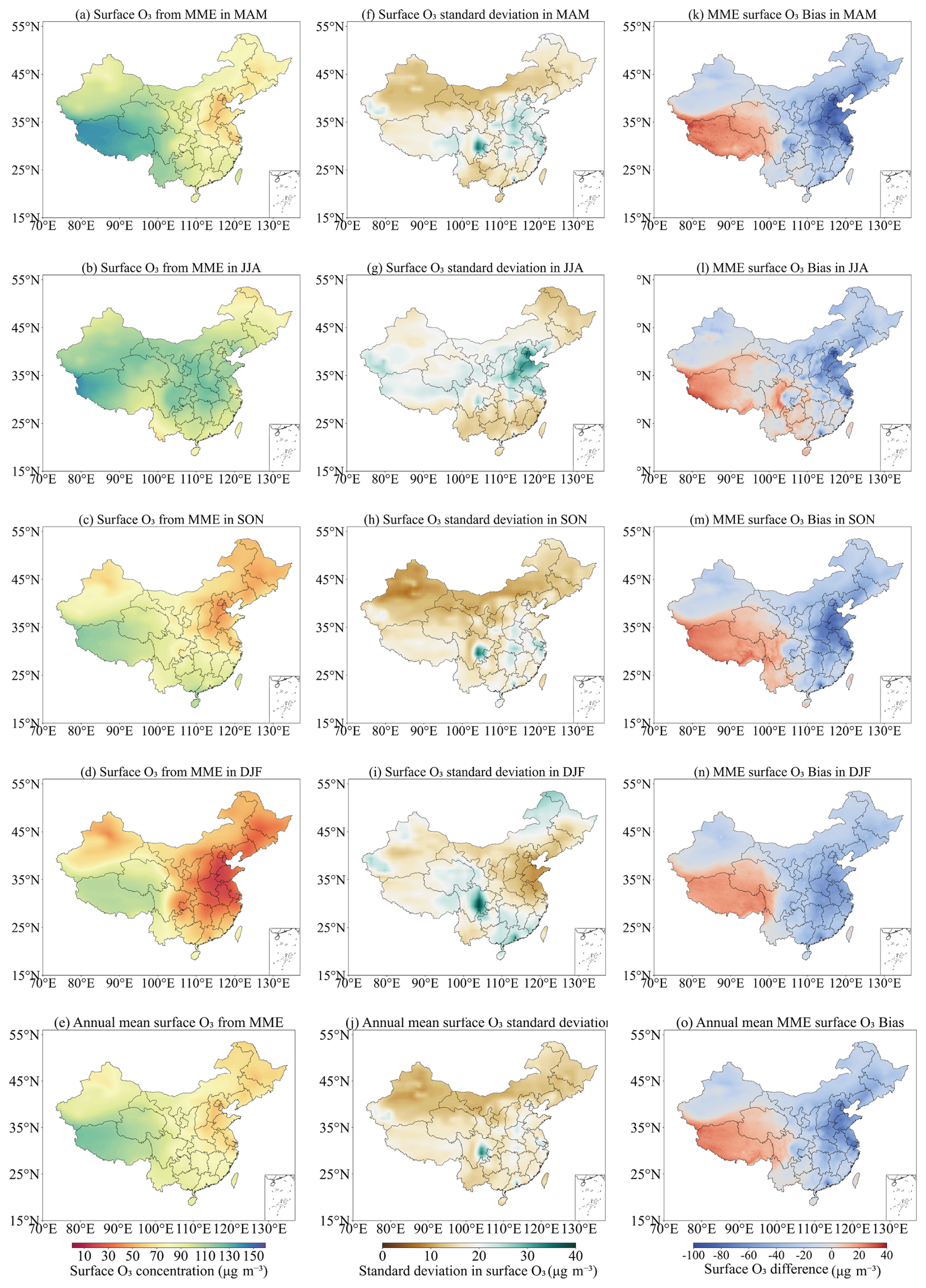 Figure 2Multi-model (nine CMIP6 models) annual and seasonal mean surface O3 concentrations over the 2015–2023 period in (a) MAM; (b) JJA; (c) SON; (d) DJF; and (e) annual mean. The SD of the MME in (f)MAM, (g) DJF, (h) JJA, (i) SON, and (j) annual mean. The difference between the MME and TAP observations in (k) MAM, (l) DJF, (m) JJA, (n) SON, and (o) annual mean.