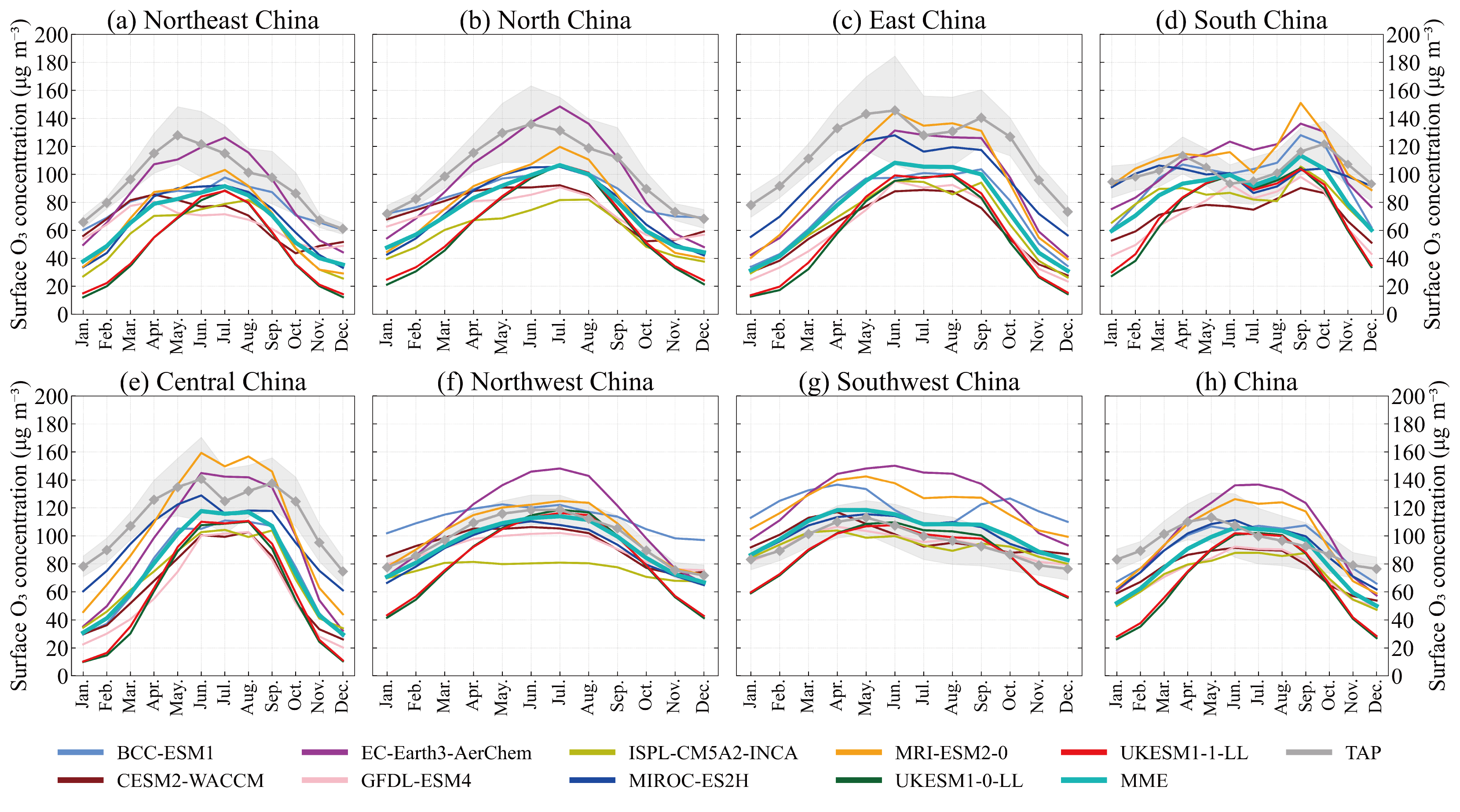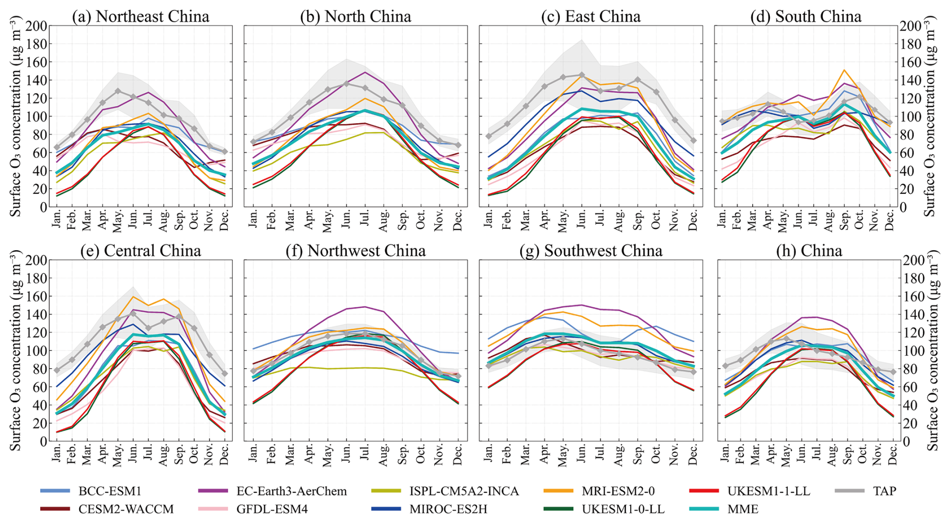 Figure 3Comparison of the annual cycle of O3 concentrations, between individual CMIP6 models, the MME and TAP in China and sub-regions for the period 2015–2023. The grey shading shows SD of TAP observations within the region.