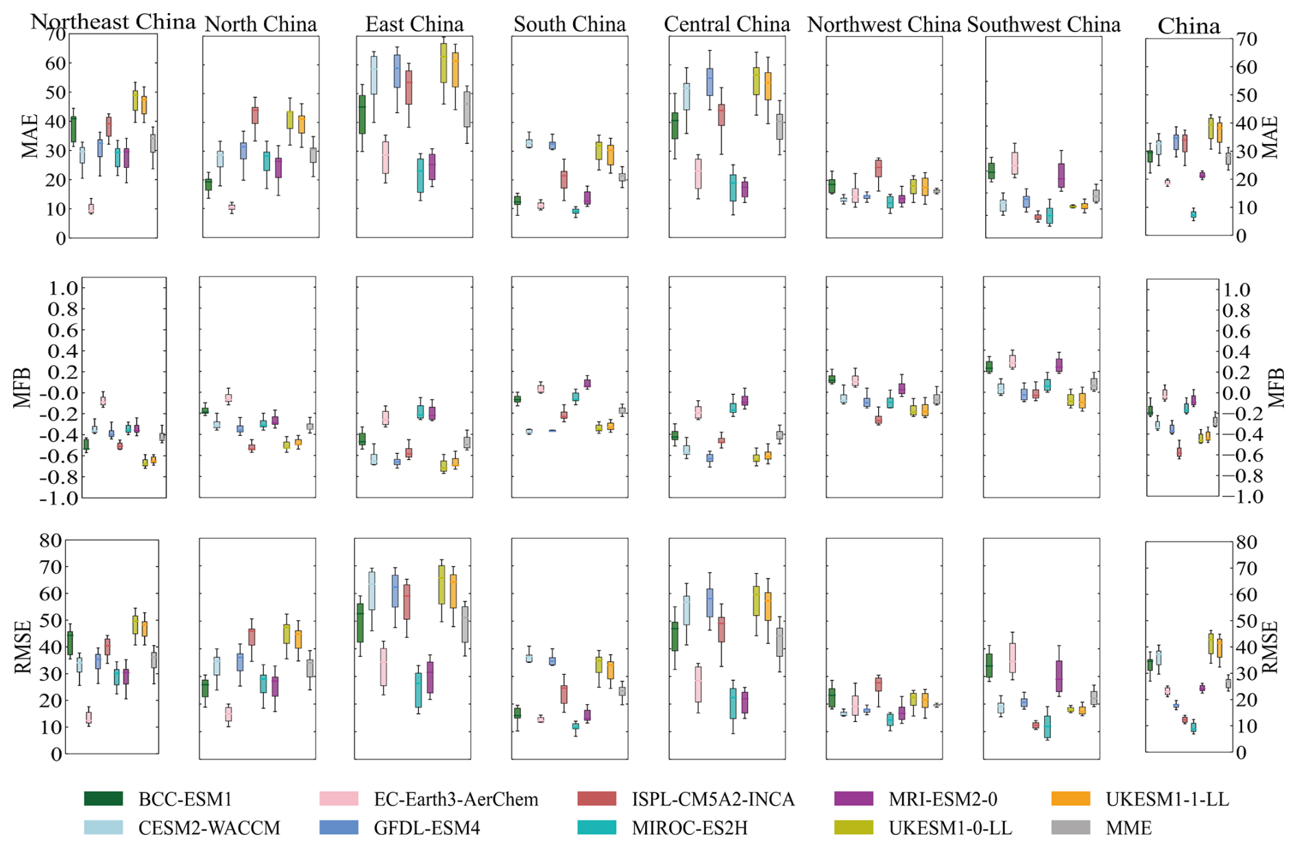 Figure 4Distribution of differences for O3 concentrations (µg m−3) from nine CMIP6 models in China and sub-regions during 2015–2023. The box plots show the 25th and 75th percentiles as solid boxes, median values as solid lines, dots represent the concentrations from MAE, MFB and RMSE, and whiskers extending to the minimum and maximum.