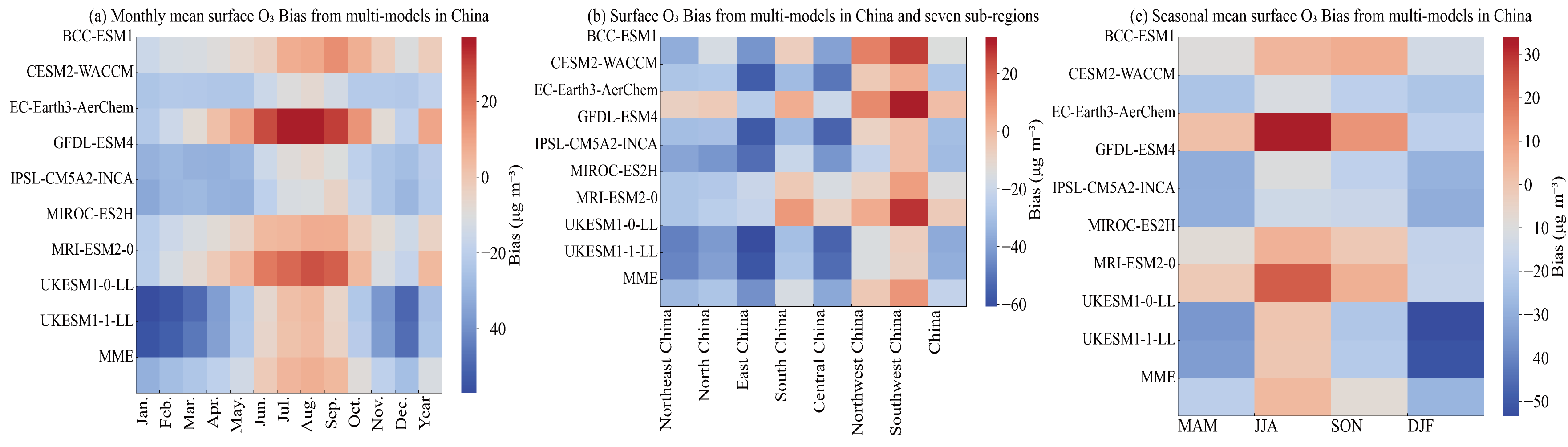 Figure 5Heatmap of O3 concentrations bias from nine CMIP6 models compared to TAP across different months, seasons and regions in China and sub-regions.