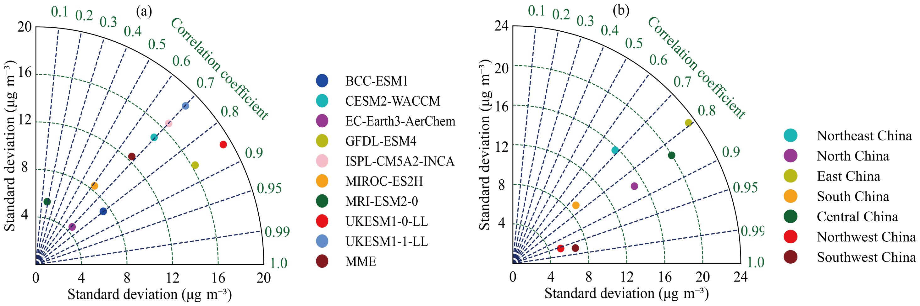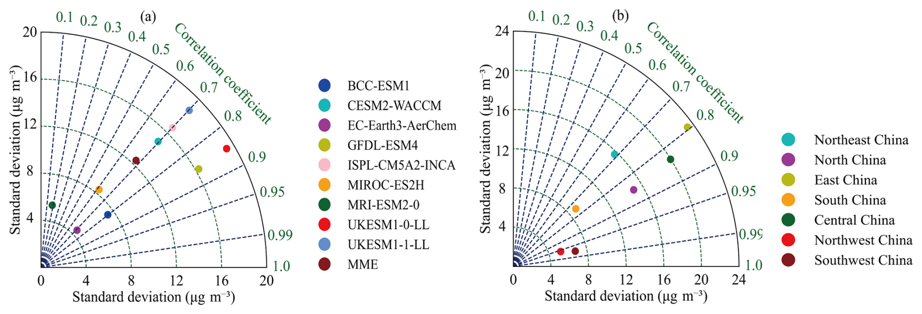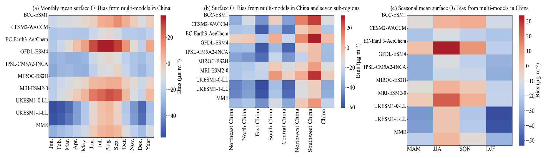 Figure 4 presents a comparison of the Mean Absolute Error (MAE), Mean Fractional bias (MFB), and Root Mean Square Error (RMSE) between the CMIP6 models and TAP for surface O3 concentrations. Combined with the bias for different months and sub-regions (Fig. 5), correlation coefficients, and SD (Fig. 6), it can be observed that the MME simulates the O3 concentration over China with the smallest bias in June and the largest in January. Among the sub-regions, the simulation results for Northwest China are the most accurate, with high correlation and the smallest MAE, MFB, RMSE, SD, and bias. In contrast, the largest MAE, MFB, RMSE, SD, and bias are found in East China, particularly in the autumn and winter. For individual models, EC-Earth3-AerChem shows the smallest annual average bias for O3 concentrations in China, with an MFB close to zero; BCC-ESM1 exhibits the best correlation; MIROC-ES2H has the smallest MAE and RMSE, providing relatively good simulation results; while UKESM1-0-LL has the largest MAE, MFB, RMSE, SD, and bias. Among the sub-regions, MIROC-ES2H provides relatively good simulations of O3 concentrations in South China, while UKESM1-0-LL shows the largest MAE, MFB, RMSE, SD, and bias in East China. Overall, the MME of CMIP6 performs better in simulating O3 concentrations during JJA, with larger discrepancies observed in DJF. The simulation in Northwest China is closest to TAP, while the largest discrepancies occur in East China. EC-Earth3-AerChem is better suited for simulating or forecasting the annual average O3 concentrations over China, while MIROC-ES2H is more appropriate for error-sensitive scenario analyses. BCC-ESM1 demonstrates superior performance in terms of correlation and temporal consistency, whereas both UKESM1-0-LL and UKESM1-1-LL exhibit higher simulation uncertainties.