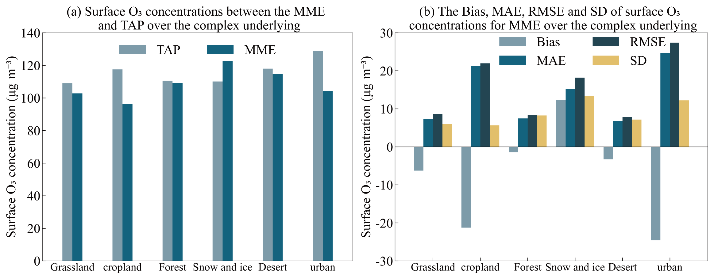 Vegetation type, land cover, and land use changes can influence biogenic emissions, which in turn affect the accuracy of model-simulated O3 concentrations (Ashworth et al., 2012). To investigate the impact of these factors on simulation discrepancies and minimize the interference of temperature changes, this study focuses on the JJA period in Northwest China, which has similar climatic conditions and complex surface types. The selected typical underlying surfaces include natural land surfaces such as grassland, forest, desert, and snow and ice (perennial snow), as well as anthropogenic land surfaces such as cropland and urban. By comparing the bias, MAE, RMSE, and SD of MME-simulated surface O3 concentrations relative to TAP (Fig. 7), it is observed that TAP simulates lower O3 concentrations over natural land surfaces compared to anthropogenic land surfaces, and the MME simulations generally follow this trend. However, the MME simulation results show the highest O3 concentrations over snow and ice surfaces and the lowest over cropland surfaces. Overall, the MME simulations exhibit lower bias, MAE, and RMSE for natural land surfaces compared to anthropogenic land surfaces, with the best performance over forest and desert surfaces, and the worst performance over urban surfaces, followed by cropland and snow and ice surfaces.