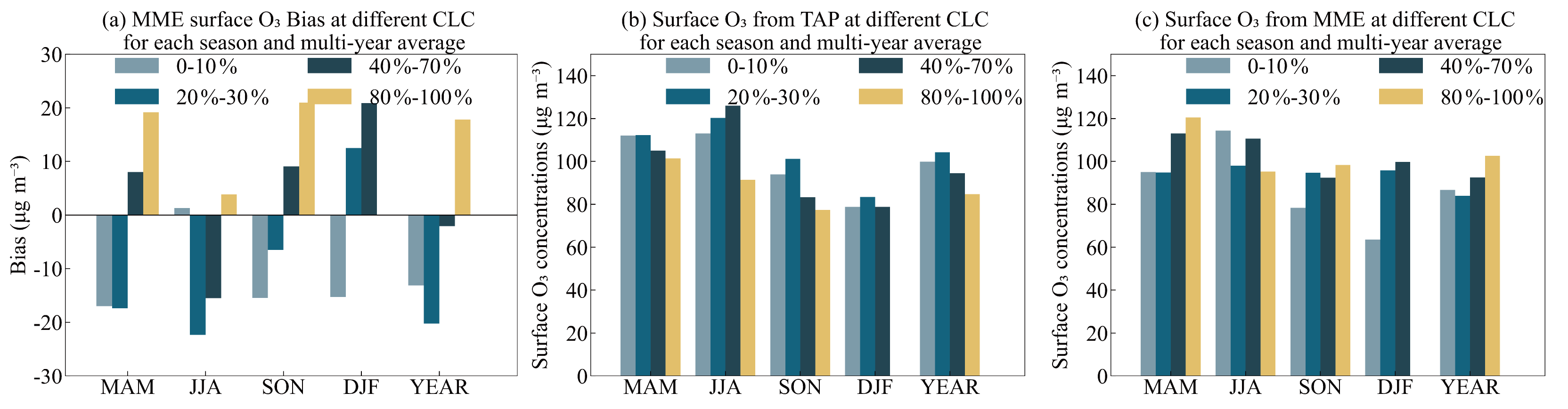 The analysis of surface O3 bias between MME and TAP under different cloud conditions (Fig. 8) is based on total cloud cover from the ERA5 monthly reanalysis dataset. Using these data, and following the classification of Han and Cong (2015), conditions were categorized into four levels: clear sky (0 %–10 %), partly cloudy (20 %–30 %), cloudy (40 %–70 %), and overcast (80 %–100 %). It is important to note that while ERA5 provides observation-constrained, physically consistent fields suitable for this diagnostic purpose, uncertainties inherent to any reanalysis (e.g., from retrieval errors and model assumptions) remain. Nonetheless, ERA5 is considered one of the most reliable datasets for studying cloud-meteorology interactions (Wu et al., 2023), supporting the robustness of our comparative analysis. The analysis results indicate that the TAP simulation exhibits the highest surface O3 concentrations under partly cloudy conditions, while O3 concentrations generally decrease with increasing total cloud cover under other cloud cover categories (except during JJA). This pattern is primarily attributed to the attenuation of solar radiation by clouds, which suppresses photochemical O3 production. In addition, accompanying precipitation processes can influence atmospheric stability and boundary layer development, which may indirectly affect surface O3 concentrations. Under partly cloudy conditions, however, the atmosphere tends to be more stable, with weaker vertical mixing, allowing O3 to accumulate near the surface. During JJA, the relationship becomes more complex. High pollutant loads and intricate meteorological conditions likely counteract the influence of total cloud cover, leading to a less straightforward association between cloud amount and O3 concentrations.