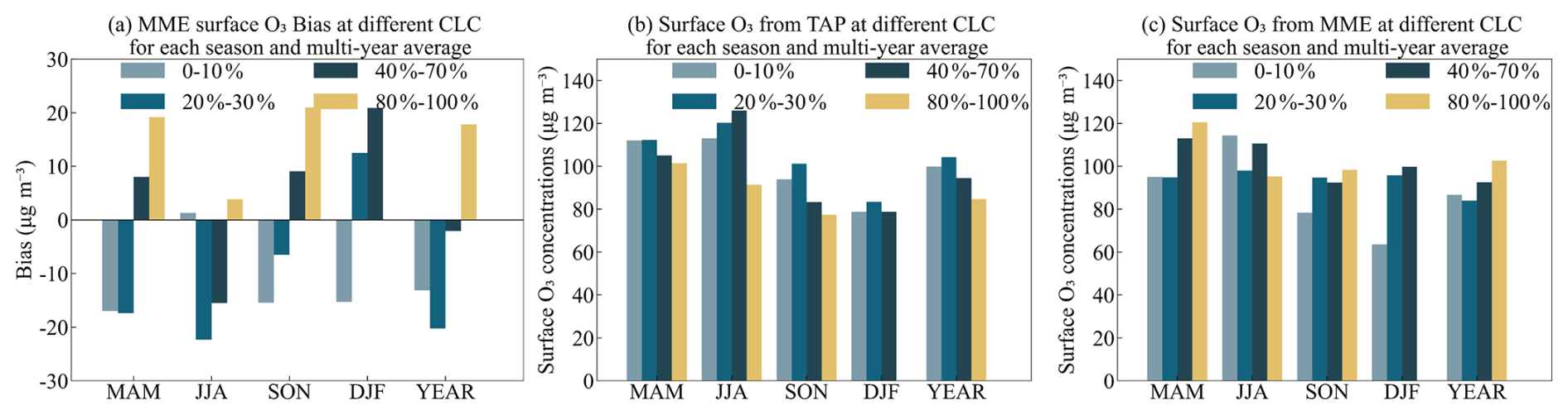The simulation biases identified over different surfaces highlight potential challenges for modeling surface O3 in China. Specifically, the high errors over cropland and urban areas likely reflect the need for improved model representation of regionally characteristic anthropogenic activities and heterogeneous land cover. Meanwhile, uncertainties over snow and ice surfaces point to gaps in modeling cold-season processes, critical for high-altitude and northern parts of China. While global models may not resolve all local processes, analyzing biases by land cover type provides crucial insight into how these regionally characteristic processes, such as the interplay of anthropogenic and biogenic emissions, deposition, and meteorology, govern surface O3 patterns. This regional perspective helps interpret model-observation discrepancies in China and provides context for understanding O3 simulation uncertainties related to land cover. These findings suggest that enhancing parameterizations for characteristic land-surface processes could improve the reliability of global and regional models applied.