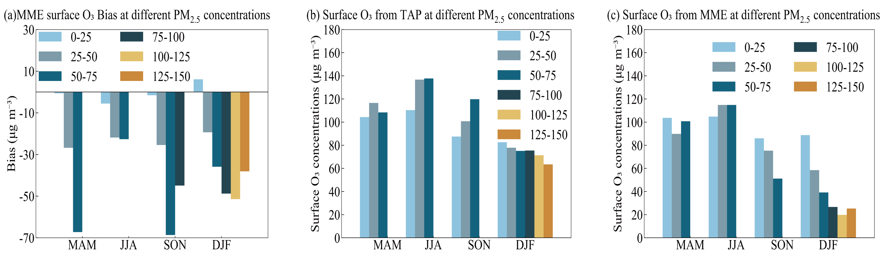 Aerosols play a crucial role in the simulation of surface O3 concentrations. Variations in PM2.5 can influence O3 formation through several pathways: (1) chemical effects: changes in aerosol composition (e.g., sulfate, nitrate, organic matter, BC) can perturb the concentrations of key radicals (e.g., OH, HO2) and thus alter photochemical reaction rates (Wang et al., 2019); (2) radiative effects: aerosols modify optical properties and reduce actinic flux at the surface, thereby suppressing photolysis rates and slowing O3 production; and (3) heterogeneous effects: reactions on aerosol surfaces can directly consume NOx or other precursors, shifting the chemical environment for O3 formation (Qu et al., 2021). Lou et al. (2014) showed that considering aerosols reduces the mean bias in simulated O3 over China from 33 % to 9 % using GEOS-Chem. Therefore, this study analyzes the bias in surface O3 concentrations simulated by the MME relative to TAP under different PM2.5 levels (Fig. 9). The results show that during the JJA and SON, when PM2.5 concentrations are relatively low, TAP data indicate that O3 concentrations increase with rising PM2.5 levels. During the DJF, when PM2.5 concentrations are higher, O3 concentrations decrease as PM2.5 levels increase. This is primarily due to the fact that, during JJA and SON, although the increases in PM2.5 concentrations can attenuate solar radiation and participate in heterogeneous uptake of HO2 and RO2 radicals. However, their overall inhibitory effect on O3 formation is relatively weaker during these seasons because abundant sunlight and strong photochemical activity compensate for aerosol-induced reductions in photolysis rates. In addition, O3 formation is typically VOC-limited regime, under which heterogeneous radical loss plays a smaller relative role (Liu et al., 2019). In contrast, during DJF, limited solar radiation, stronger atmospheric stability, and elevated NOx concentrations amplify the aerosol impacts, reduced photolysis rates become more critical, heterogeneous radical uptake more effectively suppresses the HOx cycle, and NOx titration is more likely to occur. Meanwhile, the increase in BC concentration in PM2.5 (Fig. S1) enhances the light absorption of PM2.5, further reducing UV radiation and inhibiting O3 photochemical production. Additionally, other components of PM2.5, such as NO3- and OM, may influence O3 through specific pathways, particulate nitrate photolysis generates NO2 and OH radicals, promoting O3 formation, while OM and organic nitrates modulate radical (ROx/NOx) cycling and NOx partitioning, thereby affecting O3 photochemistry (Li et al., 2025). Observational evidence from Chen et al. (2021) in Delhi supports this seasonal behavior: reductions in PM2.5 significantly enhance solar radiation, reduce AOD, and increase the photolysis rate of key O3 precursors, thereby exacerbating O3 accumulation under VOC-limited conditions, particularly in winter, when AOD is reduced by 50 %, O3 generation can increase by 25 %.