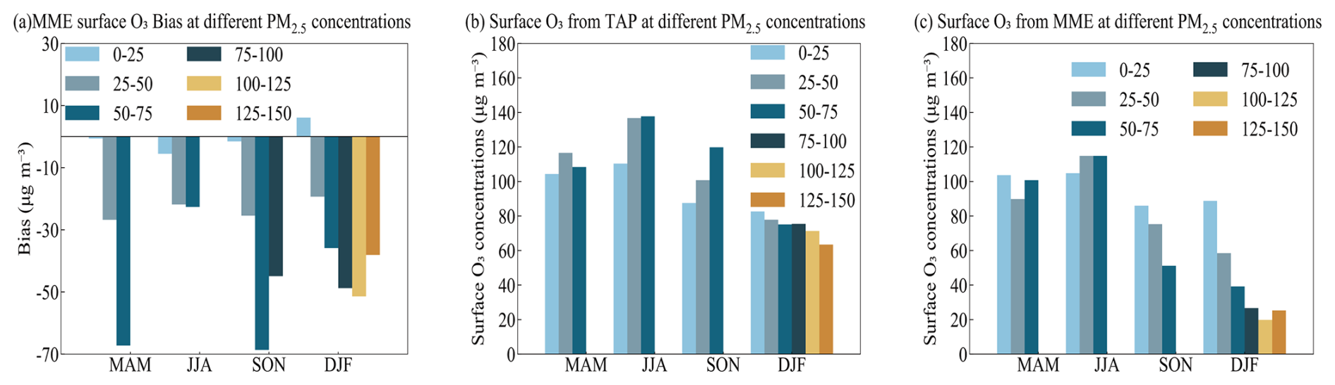 The MME simulation results indicate that surface O3 concentrations generally decrease with increasing PM2.5 levels (except during JJA). However, under extreme pollution conditions in DJF, O3 concentrations exhibit a slight increase once PM2.5 exceeds 125 µg m−3. This suggests a complex nonlinear relationship between PM2.5 and O3 formation. Previous studies have shown that reducing aerosol emissions without corresponding cuts in precursor pollutants could lead to increased surface O3 over eastern China (Li et al., 2018), indicating that aerosols suppress O3 production through light attenuation and heterogeneous reactions. At low to moderate PM2.5 concentrations, the increase in PM2.5 largely inhibits O3 formation by scavenging key radicals (e.g., HO2 and NOx) and reducing solar radiation intensity, thereby leading to a decline in O3. However, under extreme pollution conditions, especially in winter, this suppressing effect tends to saturate. Meanwhile, the nocturnal titration of O3 is weakened under high NOx conditions, which, combined with unfavorable meteorological conditions such as temperature inversions and a lower boundary layer, results in O3 concentrations no longer decreasing with further increases in PM2.5 and may even slightly increase.
