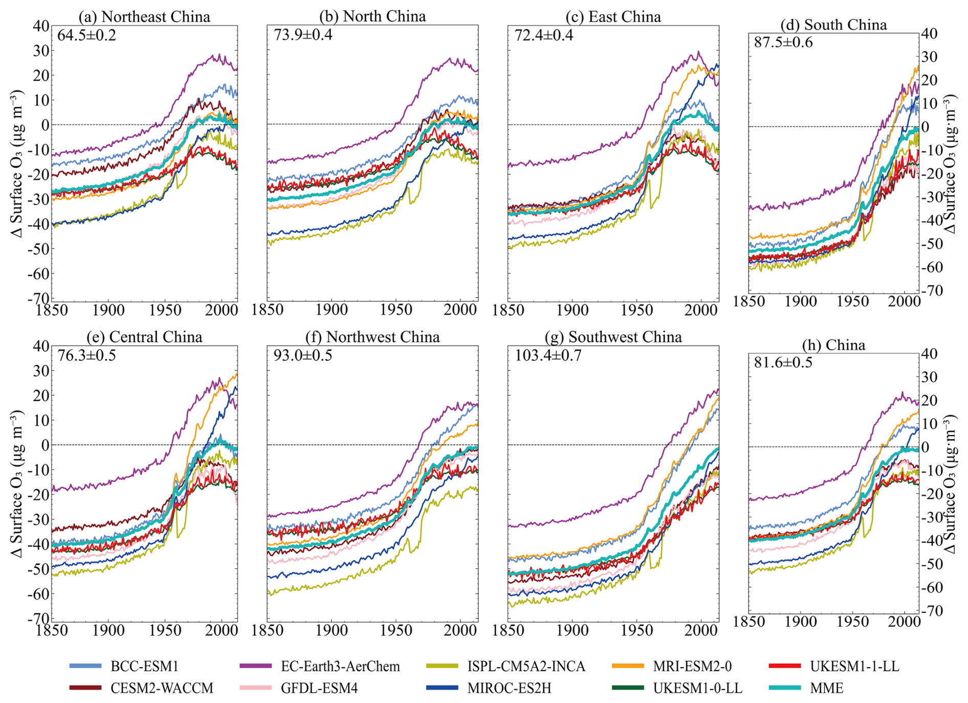 This study analyzes the changes in annual mean surface O3 concentrations in China and its sub-regions from the pre-industrial period to the present day, based on nine CMIP6 models and MME results, relative to the 2015–2023 mean (Fig. 10). The MME results show that, since 1850, the annual mean surface O3 concentration in China has increased by 39.3 ± 14.4 µg m−3 (±1 SD), with the maximum change of 57.9 µg m−3 (from the MIROC-ES2H model) and the minimum change of 23.1 µg m−3 (from the UKESM1-0-LL model). Before 1950, the annual mean increase in O3 concentration was relatively slow, at only 0.12 µg m−3; however, after 1950, the rate of increase accelerated significantly, with an annual mean increase of 0.28 µg m−3. This change is likely primarily related to the significant increase in anthropogenic activities during this period, especially the substantial increase in anthropogenic precursor emissions, such as CH4, NOx, CO, and NMVOCs. The simulations of historical O3 concentrations by different CMIP6 models show that the EC-Earth3-AerChem model yields the highest values, while the IPSL-CM5A2-INCA model yields the lowest. These differences reflect variations in aerosol, climate, and atmospheric chemistry process simulations across different models. Griffiths et al. (2021), based on ground, sounding, and satellite data from the past few decades, assess the performance of multiple CMIP6 models in simulating surface O3 concentrations. Their study indicates that these models are capable of accurately reproducing the spatial distribution, seasonal variation, and interannual variability and trends of surface O3 concentrations. This also indicates the reliability of CMIP6 models in simulating historical surface O3 variations, which provides support for their future projections of O3 concentrations under climate change scenarios.