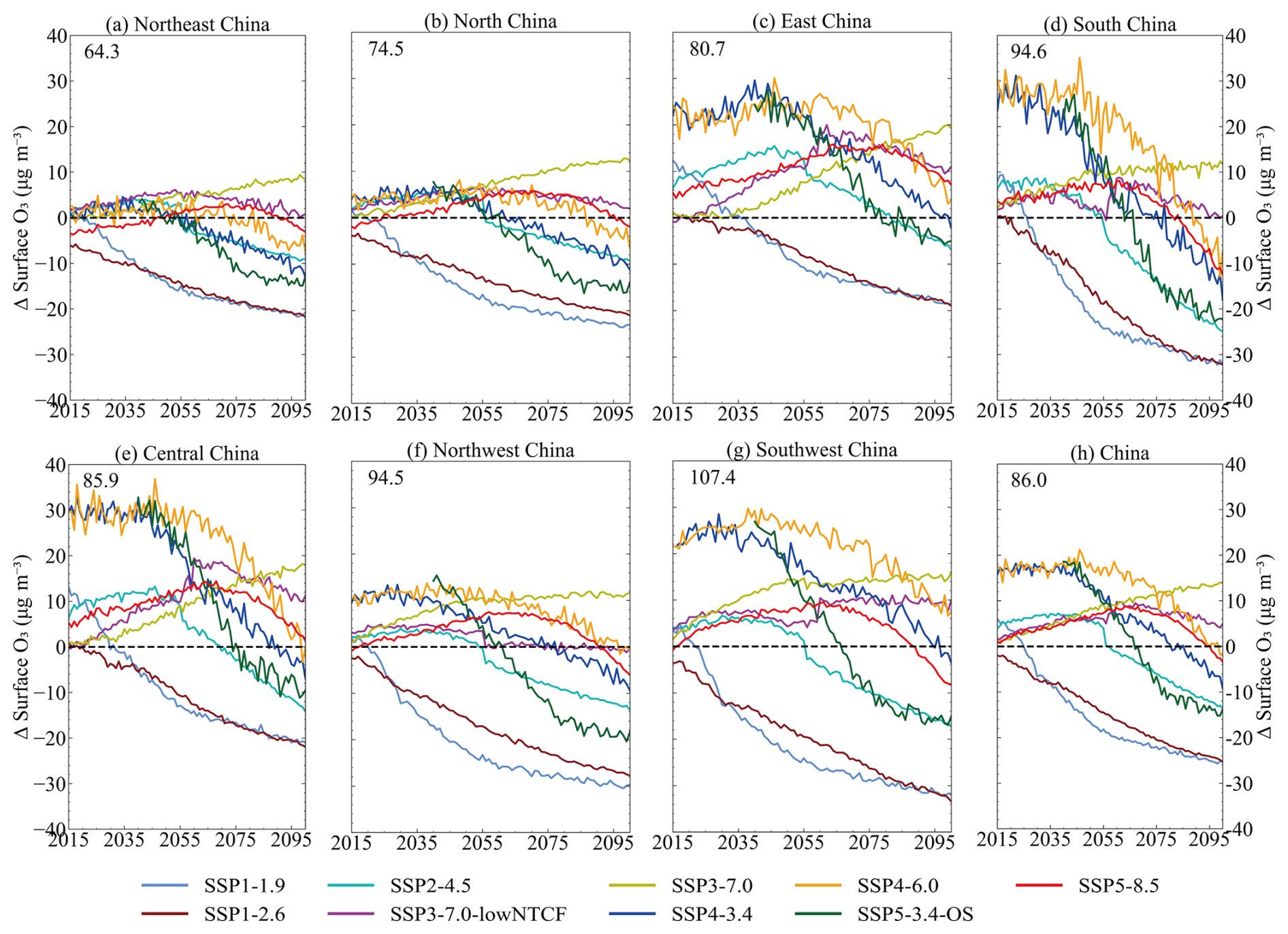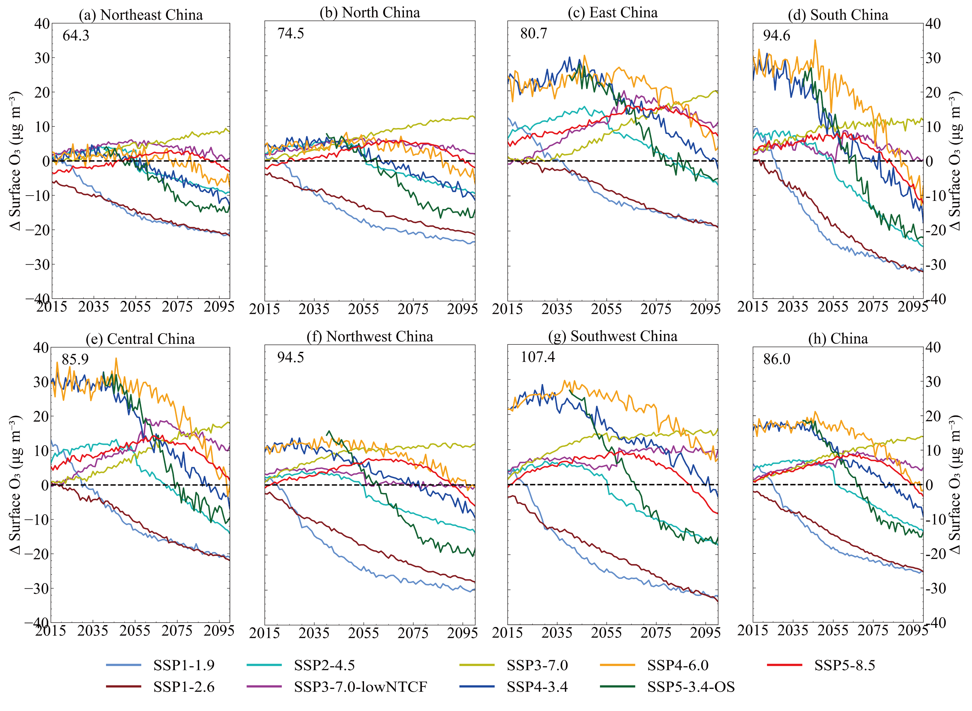 Figure 11Future China and sub-regions changes in annual mean surface O3 under different CMIP6 SSP scenarios. The dashed black line represents the curve of the difference at zero. For the Tier 2 scenarios (SSP4-3.4, SSP4-6.0, and SSP5-3.4-OS), O3 data are available only from MRI-ESM2-0. As MRI-ESM2-0 simulates higher O3 over most regions of China compared to the MME, these scenarios show larger initial deviations in the national panel and in some regions. The multi-model regional mean for 2015–2023 is shown in the top-left corner of each panel.