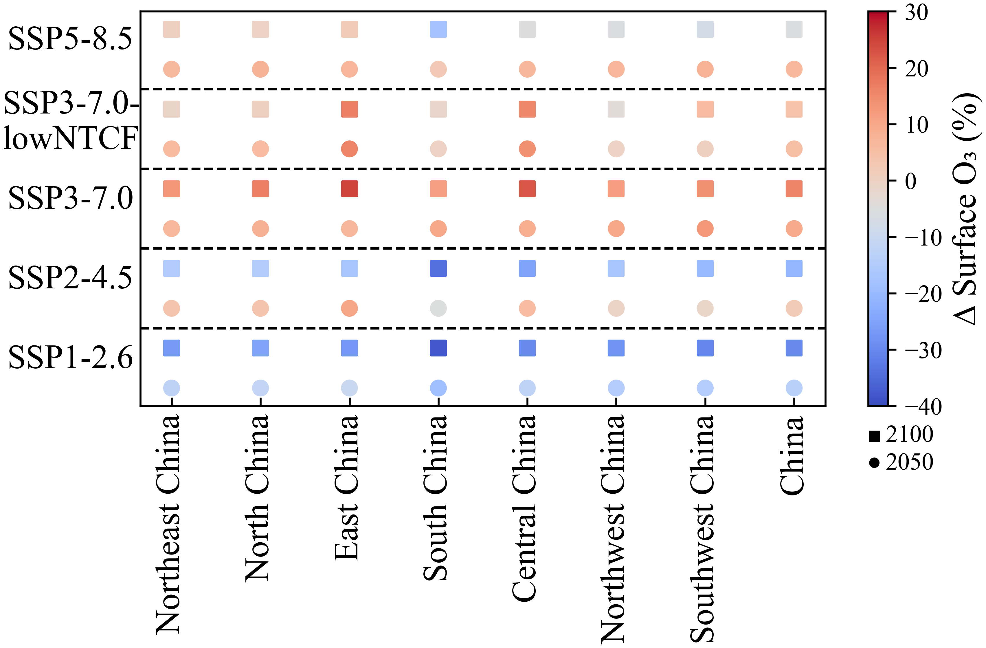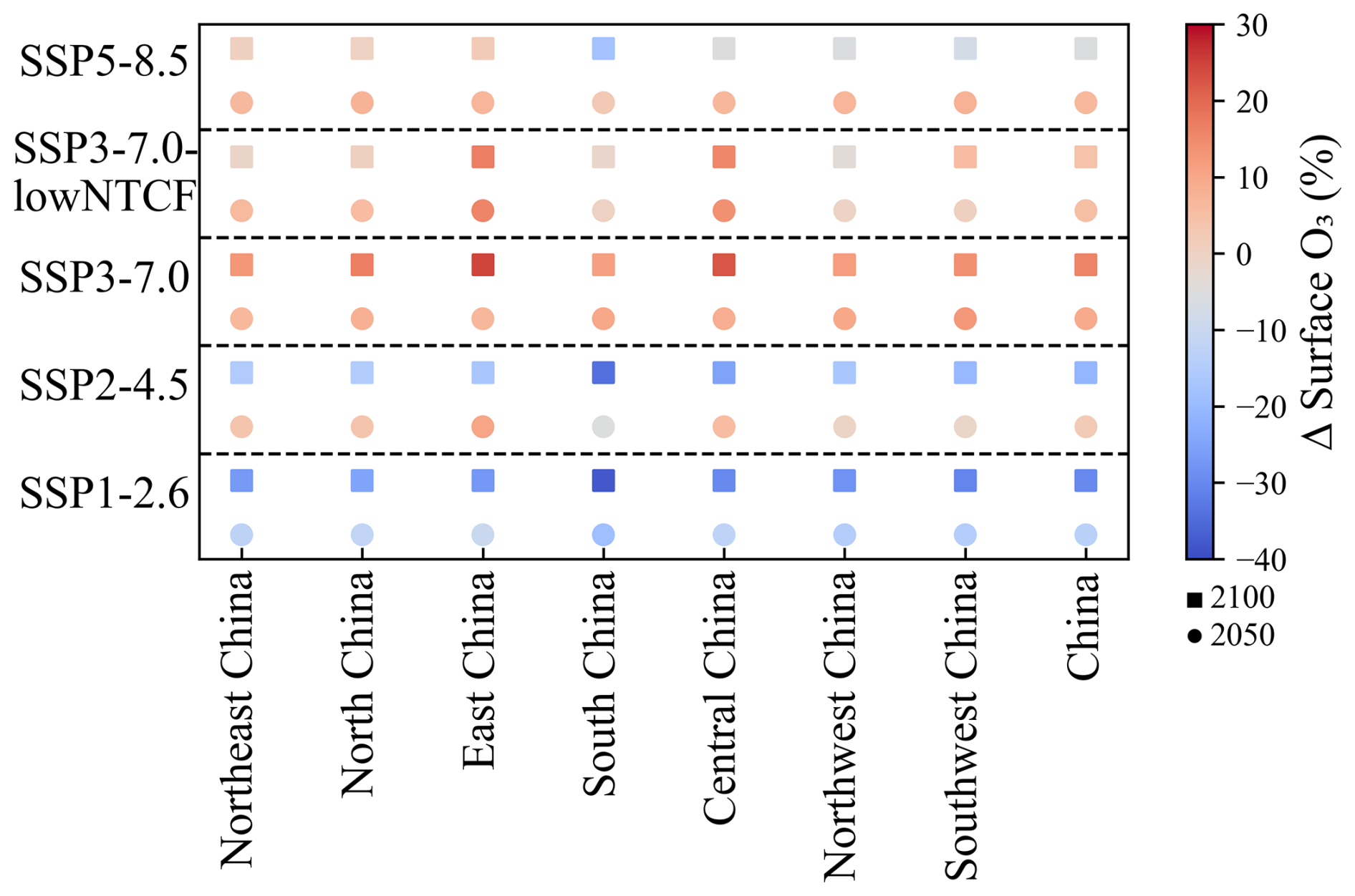 Figure 12Percentage change in 2050 (circles) and 2100 (squares), relative to 2015, for annual mean of O3 across China and sub-regions in the four Tier 1 future CMIP6 scenarios and the SSP3-7.0-lowNTCF scenario.