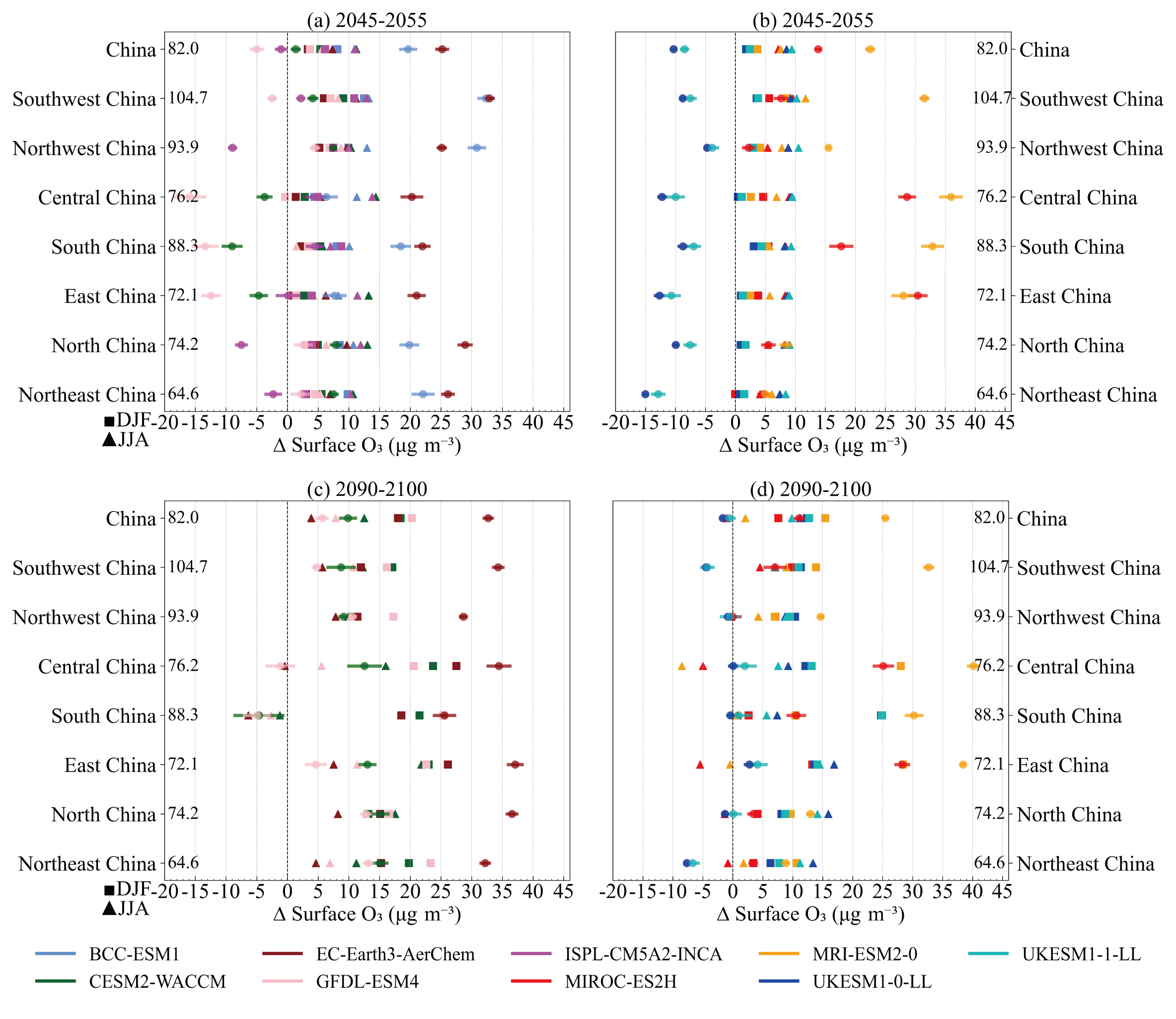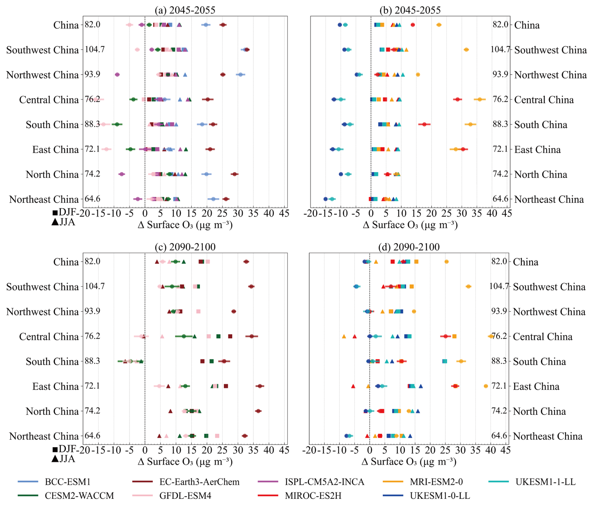 Figure 13Changes in the annual and seasonal mean surface O3 in China and its sub-regions, relative to the 2015–2023 mean, for the SSP3-7.0 scenario used in CMIP6. Each coloured circle represents the annual mean response for an individual model in (a) and (b) for 2045–2055, and in (c) and (d) for 2090–2100, with the coloured bars showing the SD across the annual mean. The seasonal mean responses for DJF and JJA, averaged over the relevant 10-year periods, are shown by squares and triangles, respectively. The multi-model regional mean for the 2015–2023 period is shown on the left of each panel.