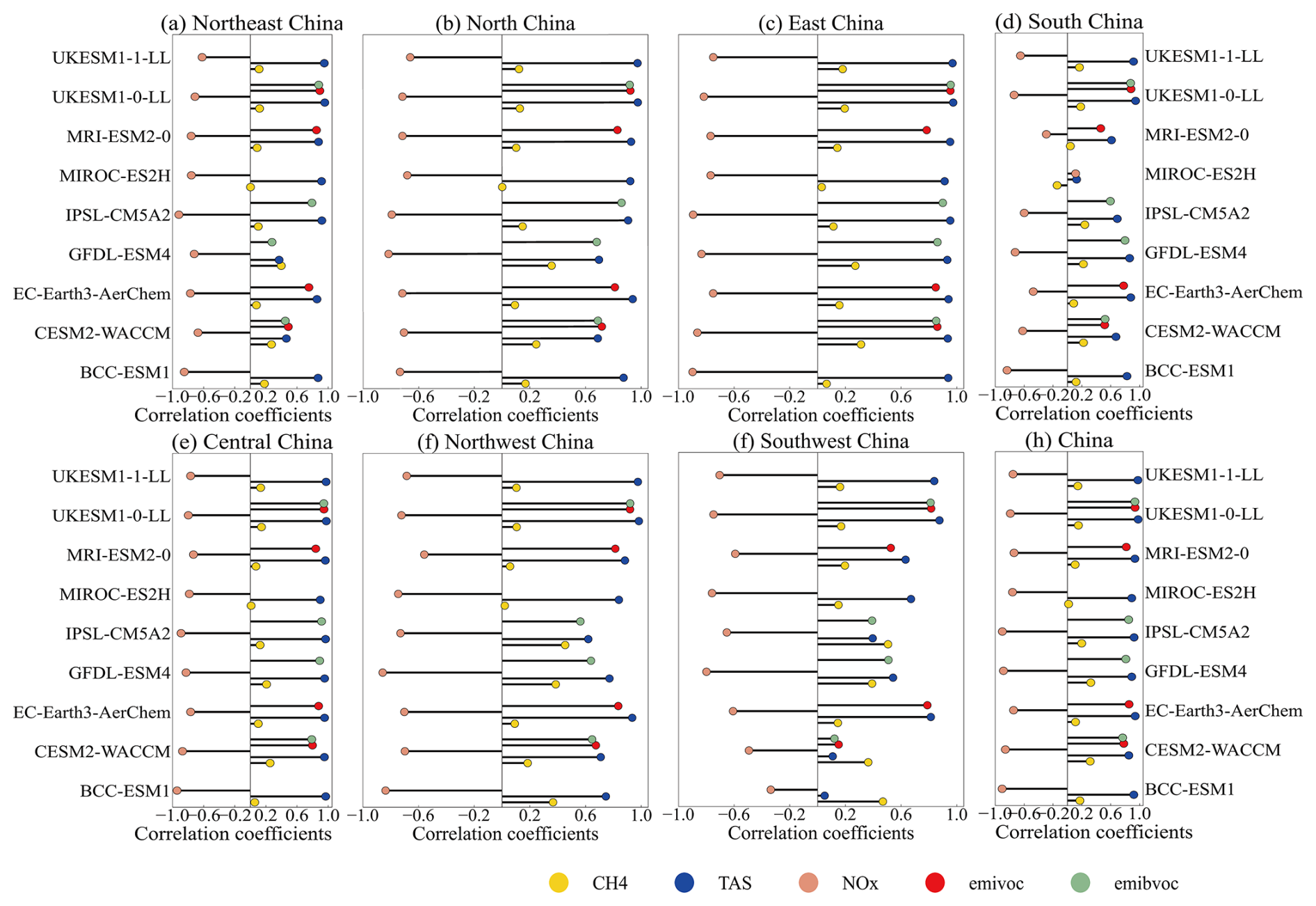 Figure 14Correlation coefficients calculated when comparing future annual mean surface O3 concentrations against individual variables of surface CH4 concentrations, temperature at Surface (TAS), emissions of NMVOCs and BVOCs, NOx (NO + NO2) concentrations and from individual CMIP6 models over the period 2015 to 2100 in the SSP3-7.0 scenario.
