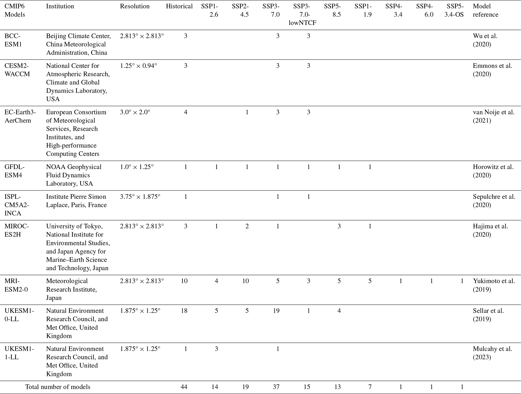 Turnock, S. T., Allen, R. J., Andrews, M., Bauer, S. E., Deushi, M., Emmons, L., Good, P., Horowitz, L., John, J. G., Michou, M., Nabat, P., Naik, V., Neubauer, D., O'Connor, F. M., Olivié, D., Oshima, N., Schulz, M., Sellar, A., Shim, S., Takemura, T., Tilmes, S., Tsigaridis, K., Wu, T., and Zhang, J.: Historical and future changes in air pollutants from CMIP6 models, Atmos. Chem. Phys., 20, 14547–14579, https://doi.org/10.5194/acp-20-14547-2020, 2020.
