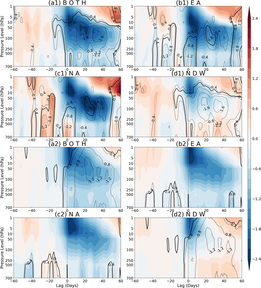 Comparing CESM2-WACCM simulations (Fig. 1a2–d2) with ERA5, the pre-SSW signals are not clearly discernible in CESM2-WACCM, yet the characteristics of the NAM is highly consistent. The conclusions are nearly unchanged if the reanalysis is replaced by model simulations: the downward propagation of the NAM is more continuous during EA than NA, and the NAM is much shallower during the NDW than during DWs. The similar evolution patterns observed in ERA5 and CESM2-WACCM indicate that the characteristic differences are not confined to the fewer events in the observational data, lending confidence to the robustness of the conclusions.