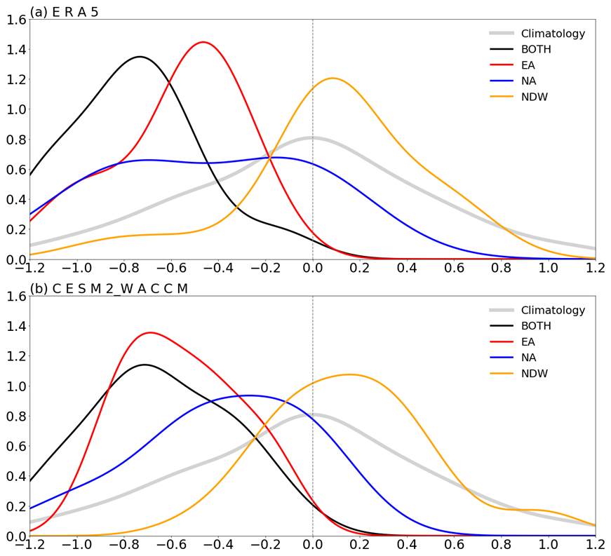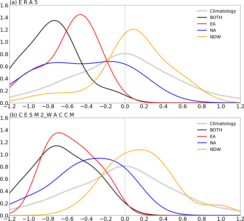 In the model simulation (Fig. 2b), the probability density function distribution of the NAO indices also highly resembles that in ERA5 (Fig. 2a). Namely, the mean probability density function for BOTH and EA is much more left-skewed than that for NA. Consistent with ERA5, the probability density functions of BOTH and EA exhibit a higher degree of overlap. The probability density function for NA is distributed more flattened than that for BOTH and EA. Moreover, due to the larger sample size, the peak values can be seen more clearly for NA. The probability density function distribution is almost symmetric on both sides of zero for NDW in both ERA5 and CESM2-WACCM, although the peak value (∼1.1) is larger than that for the climatological probability density function (∼0.8).