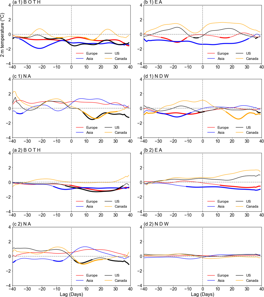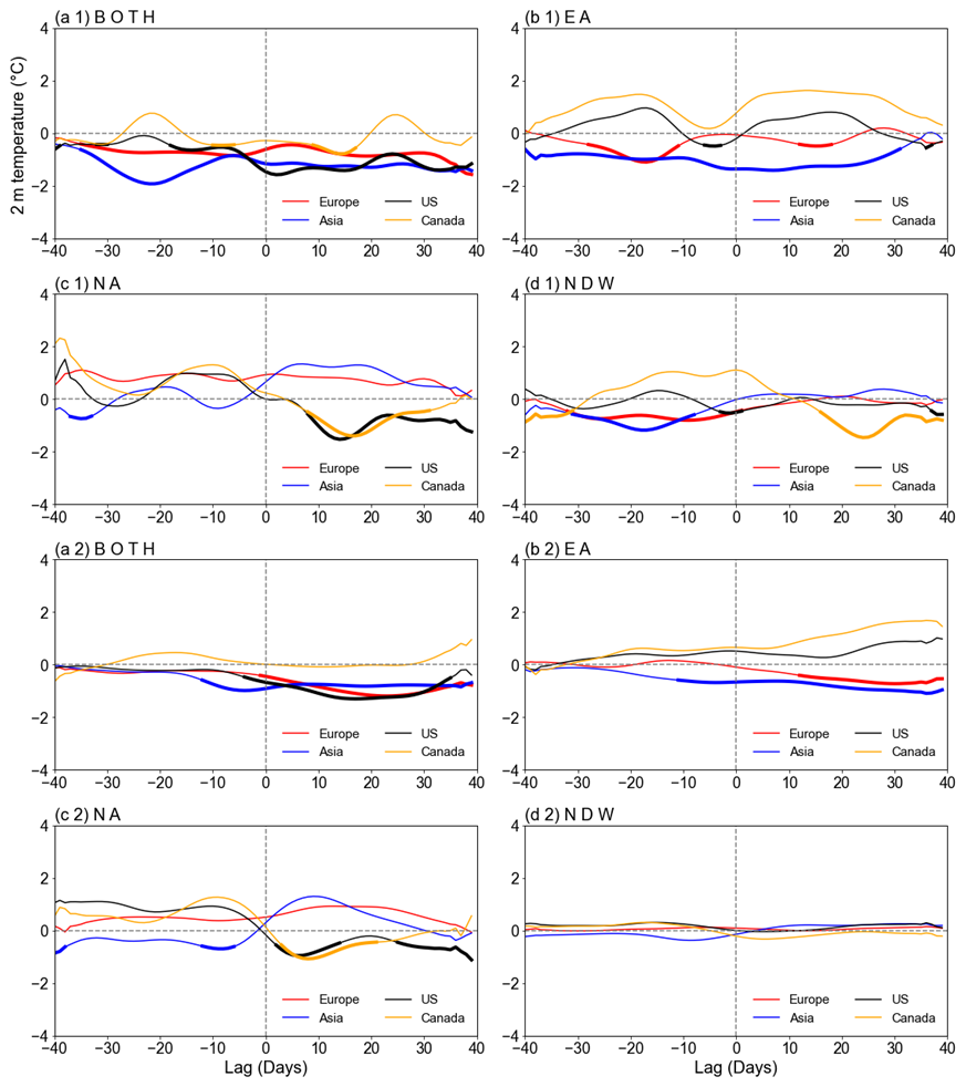 To well depict the dynamic process of the near surface response to different types of SSWs, the composite evolution of t2m anomalies over Eurasia and North America is shown in Fig. 4. In both datasets, for the type BOTH, cold anomalies develop following the SSW occurrence period from day 0 to day 40 over all the four regions (Europe, Asia, US, and Canada), except that the negative t2m anomalies at Canada are relatively weak and exhibit relatively large subseasonal variability (Fig. 4a). For the type EA, cold anomalies are persistent over northern Eurasia, larger in Asia than in Europe, while warm anomalies are persistent over North America, larger in Canada than in US (Fig. 4b). For the type NA, the reversal of temperature anomaly sign is observed over North America (US and Canada). The reversal of temperature anomalies from positive to negative indicates outbreaks of cold air (Lehtonen and Karpechko, 2016). Namely, cold air outbreaks increase in North America, while the anomalously cold state gradually recovers to normal in Asia (Fig. 4c). For NDWs, the temperature anomalies are fairly weak throughout the SSW onset except that Canada experiences a transition from anomalously warm state to cold (Fig. 4d).
