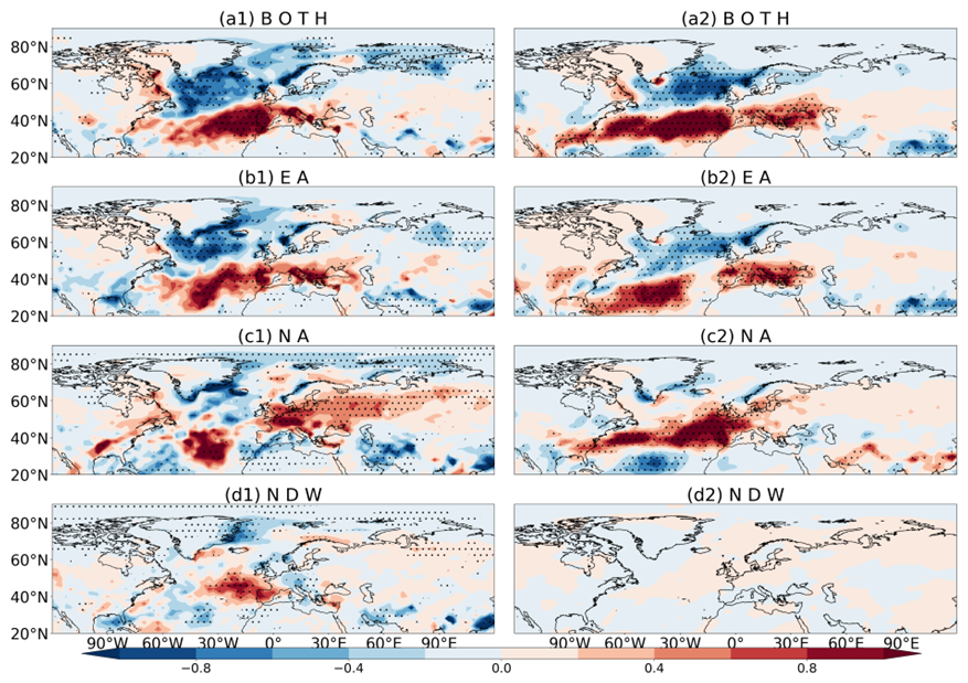 It is assumed that following the DW event onset, continental cold anomalies can develop over Eurasia and/or North America, implying an increase in cold air outbreaks after the DW SSW onset. To better describe and distinguish the DWs, we further divide DWs based on the near-surface (2 m) air temperature anomalies over land within 40 d after the onset of DWs. Considering that cold surges are more active over the Eurasia (Europe + Asia) and North America (US + Canada) following the DWs, a comparison between the cold anomalies over the two regions can further classify the DWs into three types: cold anomalies only appearing over North America (NA), only appearing over Eurasia (EA), and over both regions (BOTH). Regions focused in this study include Europe (40–70° N, 0–60° E), Asia (40–70° N, 60–140° E), United States (30–46° N, 70–120° W), and Canada (46–60° N, 60–120° W). Within one region, the area-averaged 2 m temperature anomalies over a 40 d period are considered to be associated with the downward impact of the DW if the anomalies meet the following two criteria: (1) the percentage of days with cold anomalies is greater than 50 %; (2) the mean temperature anomaly over a 40 d period is less than −0.3 °C. This threshold can classify all DWs into the three types. For the mainland, as long as one district meets the criteria, it is considered to be associated with the downward impact of the preexisting DW.