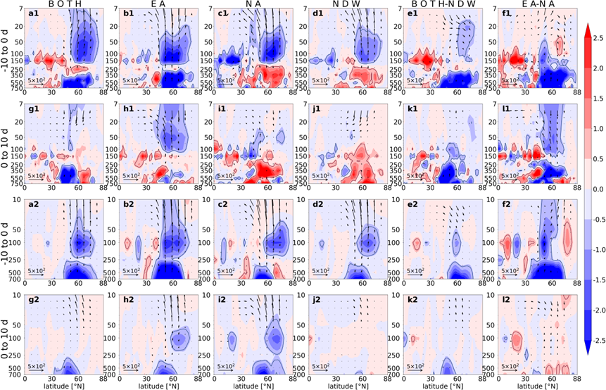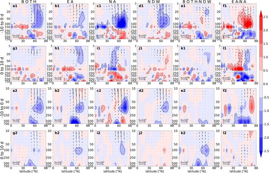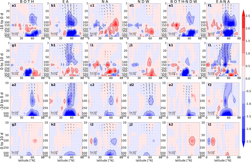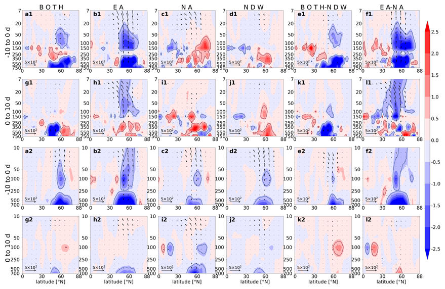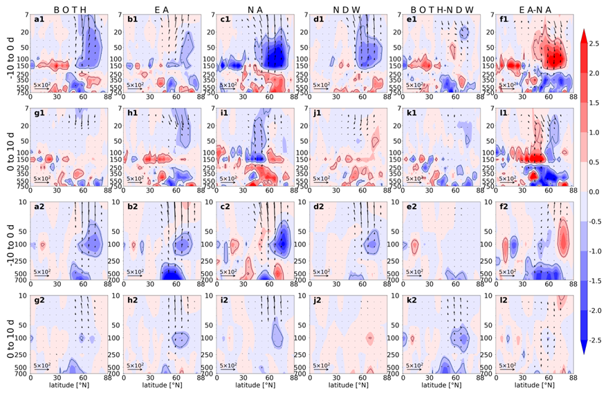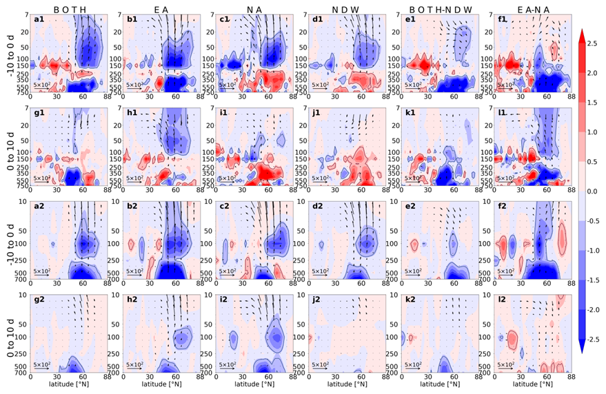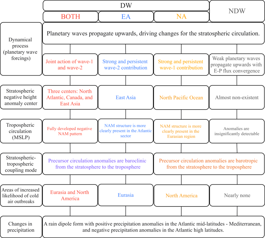 The dynamic differences for the three types of DWs are also featured by the wave activities. Firstly, the wave 1 forcing for them (BOTH, EA, and NA) shows a similar structure in the pre-onset period: the upward propagation of wave 1 increases, and the anomalous E–P flux convergence denotes a dissipation of wave 1 in the lower stratosphere. In the post-onset period, the enhancement of upward-travelling wave 1 terminates for BOTH and EA, but presents for NA. Secondly, the wave 2 forcing behaves in very different spatiotemporal structures: the wave 2 is enhanced to propagate upward in the pre-onset period for all types of DWs, but the wave dissipation in the stratosphere is only detected for BOTH and EA. In the post-onset period, the upward propagation of wave 2 is instantly suppressed for BOTH and NA, while the wave 2 forcing is still strong for EA.