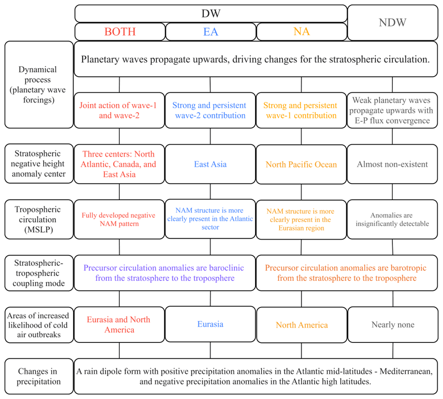 Different SSW classifications are widely used in literature. For example, based on vortex geometry shape the SSWs are classified as split, displacement, and mixed types (Charlton and Polvani, 2007; Rao et al., 2019). Based on whether the stratosphere reflects planetary waves during the westerly recovery phase following the SSW onset, it can be divided into absorbing and reflecting types (Kodera et al., 2016). According to whether the event has had a significant impact on the troposphere, it can be grouped into downward (DW) or non-downward (NDW) types (Jucker, 2016; Runde et al., 2016; Karpechko et al., 2017; White et al., 2019; Chwat et al., 2022). Although the DW SSWs show negative NAM signals from the troposphere to the stratosphere, the near surface response structure is still different among DWs, with cold extreme sometimes only appearing in Eurasia, sometimes only in North America, and sometimes in both continents. However, there is still not a widely accepted subclassification for DWs events based on the coverage of the near-surface cold anomalies associated with SSW. This study is mainly concerned with two questions: (1) What are the inter-case differences in the DW influence on the troposphere although by definition the NAM during DWs shows downward propagation to the lower troposphere? (2) What can we learn from the classification for DWs? While the present analysis does not aim to establish a direct causal mechanism for these differences, it highlights robust and systematic contrasts among DW events. This identification provides a physically interpretable framework for organizing the diversity of DW events and offers useful information that may help constrain and guide future investigations into the mechanisms governing their tropospheric impacts.