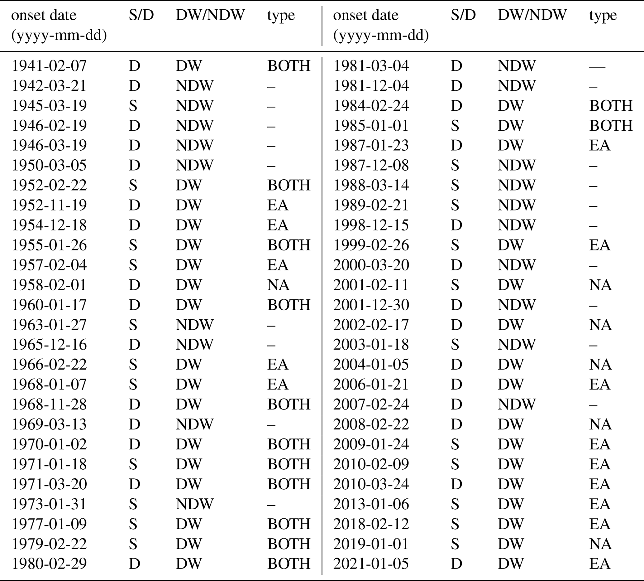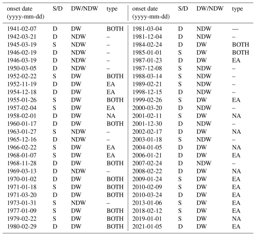 Table 1Statistics of the SSWs from 1940–2022. The second column (S/D) shows the SSW type based on the vortex shape (D = displacement, S = split). The third column shows the SSW type based on whether the stratospheric signal propagates downward (DW = downward, NDW = non-downward). The last column shows the subclassification of DWs.