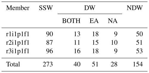 The classification of SSWs into split and displacement events is based on the method initially developed by Mitchell et al. (2011) and adapted by Seviour et al. (2013) using the two-dimensional (2D) moment analysis method. Maycock and Hitchcock (2015) modified this analysis method by using the geopotential height at 10 hPa instead of the potential vorticity used in Mitchell et al. (2011). Maycock and Hitchcock (2015) defined the edge of the polar vortex as the climatological mean geopotential height over 60° N and 10 hPa in winter, and this definition is adopted in this study. Maycock and Hitchcock (2015) employed the following thresholds: a displacement event is identified when the centroid latitude is less than 66.5° N for a minimum of seven consecutive days, while a split event is defined when the vortex aspect ratio larger than 2.8 for at least seven consecutive days. Several modifications for some parameters in this study are as follows. We choose the thresholds as the most equatorward 5.7 % of centroid latitudes and largest 5.2 % of aspect ratios, yielding a threshold of 62.9° N for centroid latitude and 2.46 for aspect ratio, respectively (e.g., Mitchell et al., 2011; Seviour et al., 2013). Table 1 shows the onset date and specific categorization of each event in ERA5. The general statistics of SSWs from the three historical simulation members by CESM2-WACCM are shown in Table 2. In ERA5, types BOTH, EA, NA and NDW account for approximately 25 %, 27 %, 12 % and 36 % respectively. In CESM2-WACCM, the corresponding proportions are 14 %, 19 %, 11 % and 56 %, respectively.