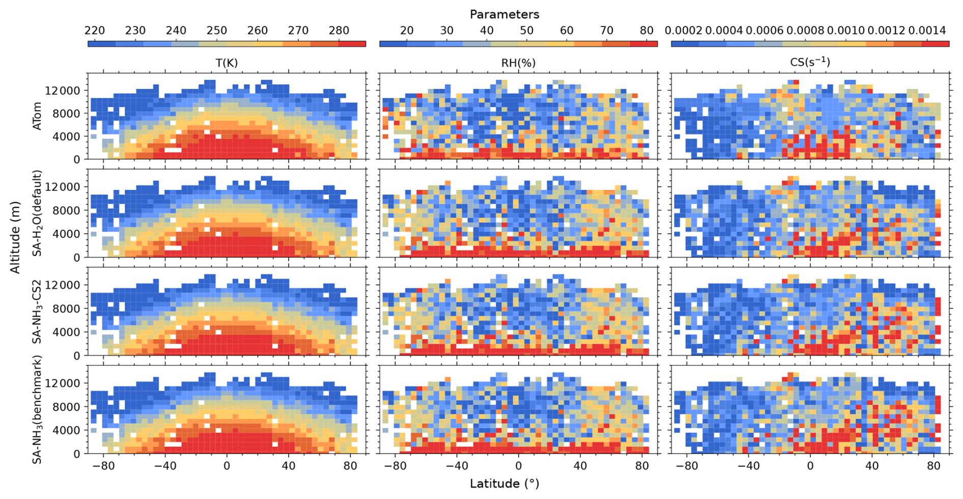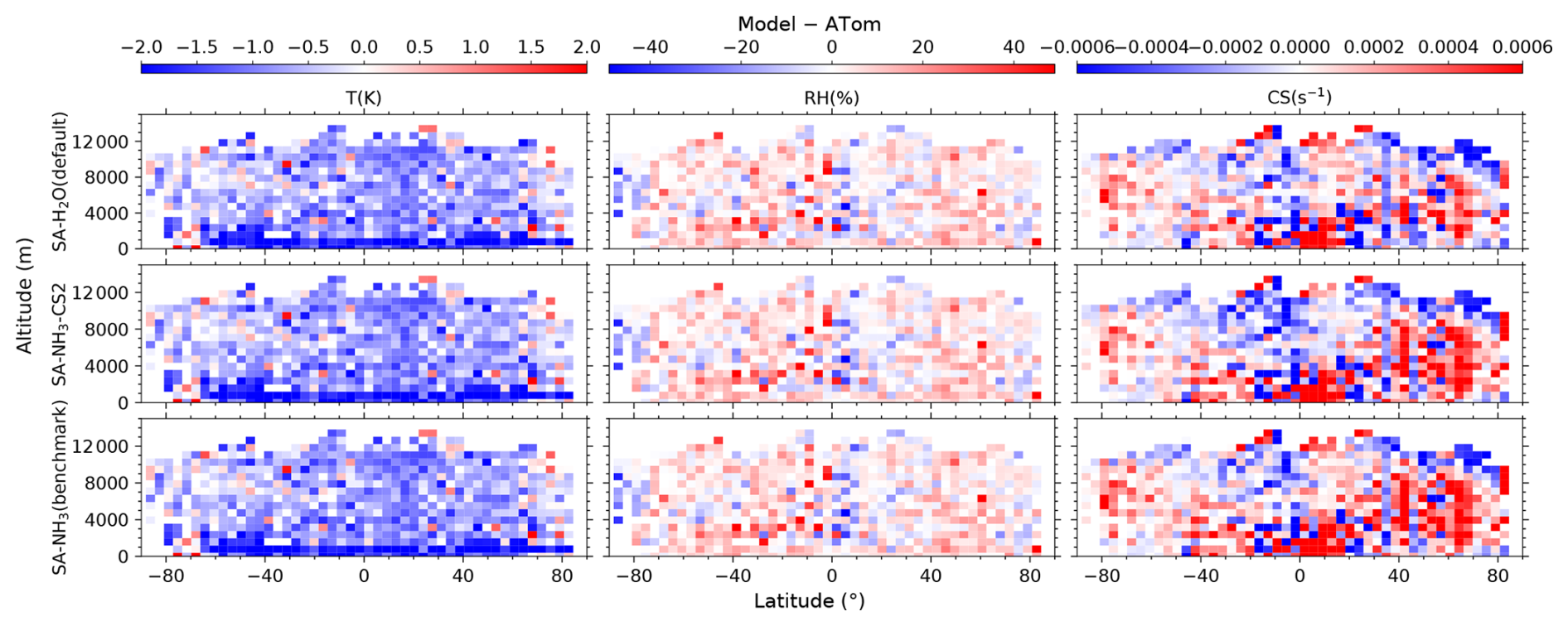 Regarding precursor gases, the SO2 data from ATom-1, -2, and -3 had insufficient sensitivity (detection limit > 100 pptv) for typical remote marine conditions (tens of pptv). Therefore, only the SO2 data from ATom-4 are used in this evaluation. The instrument used during the ATom-4 campaign was a laser-induced fluorescence (LIF) instrument capable of detecting SO2 down to approximately 2 pptv, even at pressures as low as 35 hPa, making it ideal for the ATom measurement requirements (Rollins et al., 2016). OH concentrations were measured using the Penn State Airborne Tropospheric Hydrogen Oxides Sensor (ATHOS), which reported detection limits of approximately 4.5 × 105 cm−3 near the surface and 1.5 × 105 cm−3 at 10 km altitude. O3 concentrations were measured by the National Oceanic and Atmospheric Administration (NOAA) NOyO3 instrument (Pollack et al., 2010).