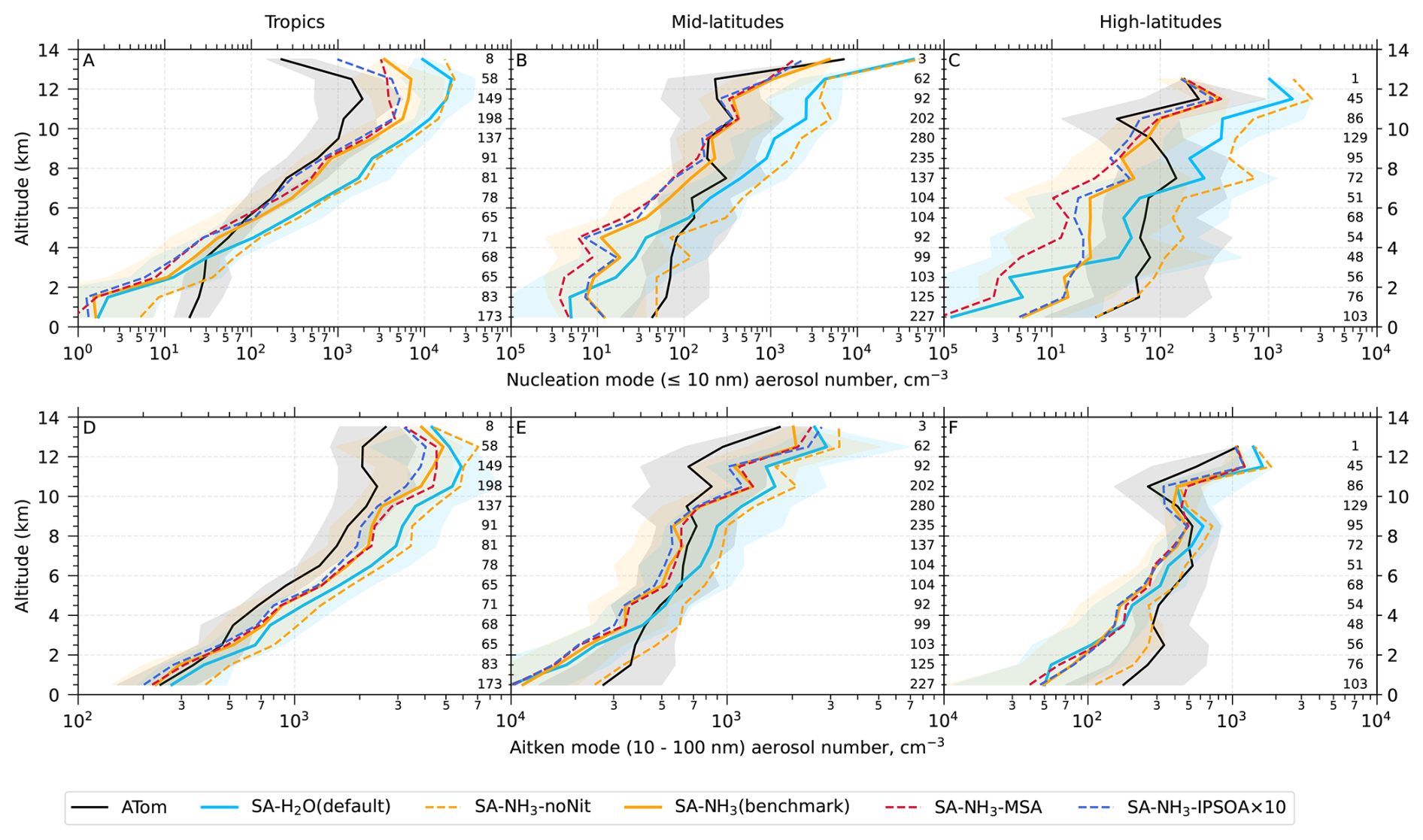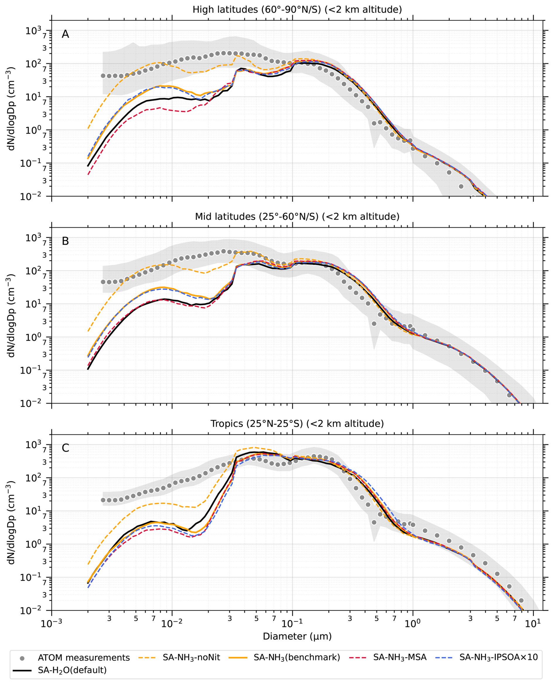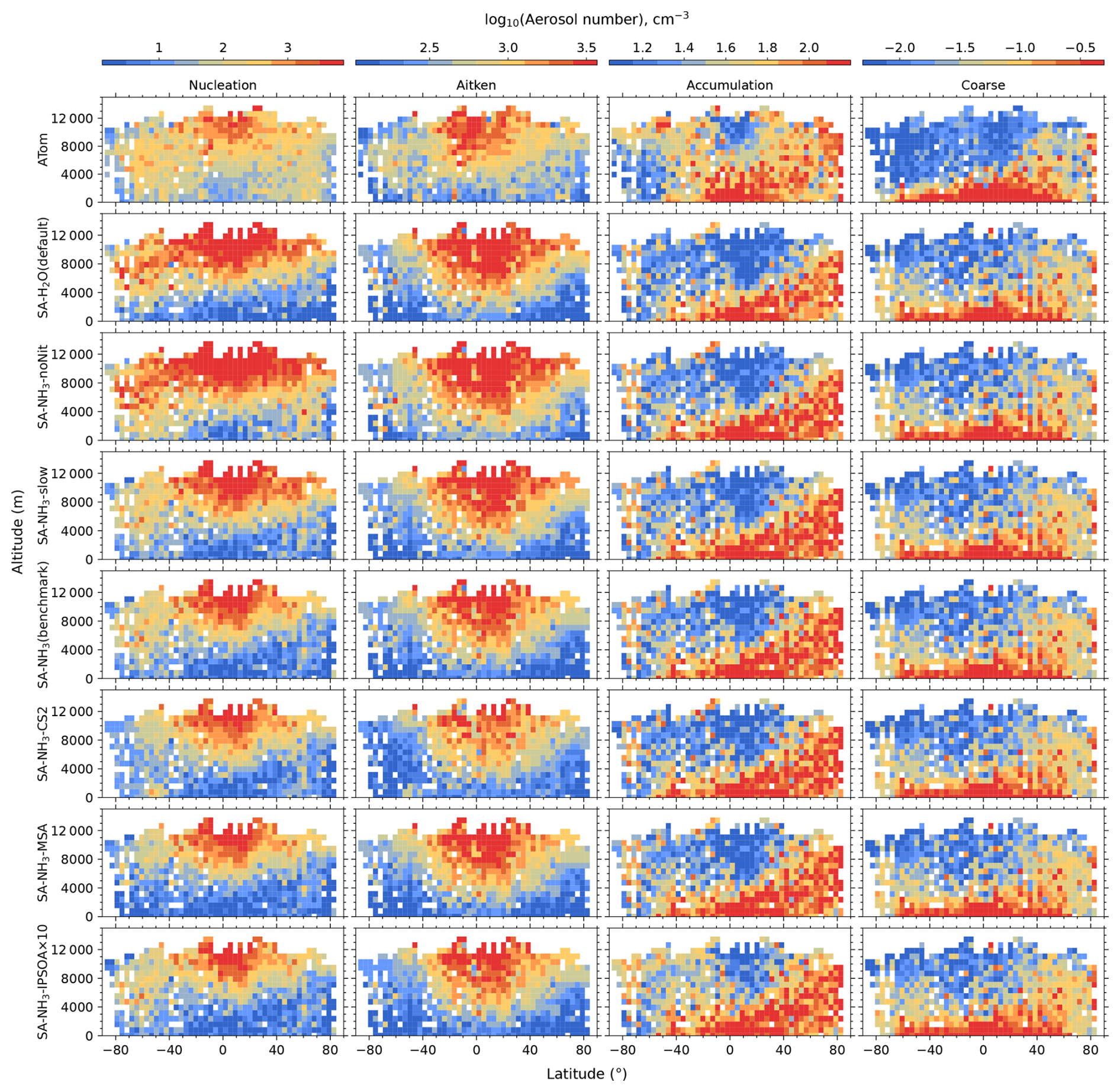 Unless otherwise noted, reported observational and model data for aerosol number concentrations, vapour condensation sink, and aerosol mass concentrations used in this study have been converted to standard temperature and pressure (STP: 273.15 K, 1000 hPa). To enable direct comparisons between the model output and observations, aerosol number size distributions from ATom were recalculated into consistent size modes: nucleation mode (< 10 nm in diameter), Aitken mode (10–100 nm), accumulation mode (100 nm–1 µm), and coarse mode (1–10 µm).