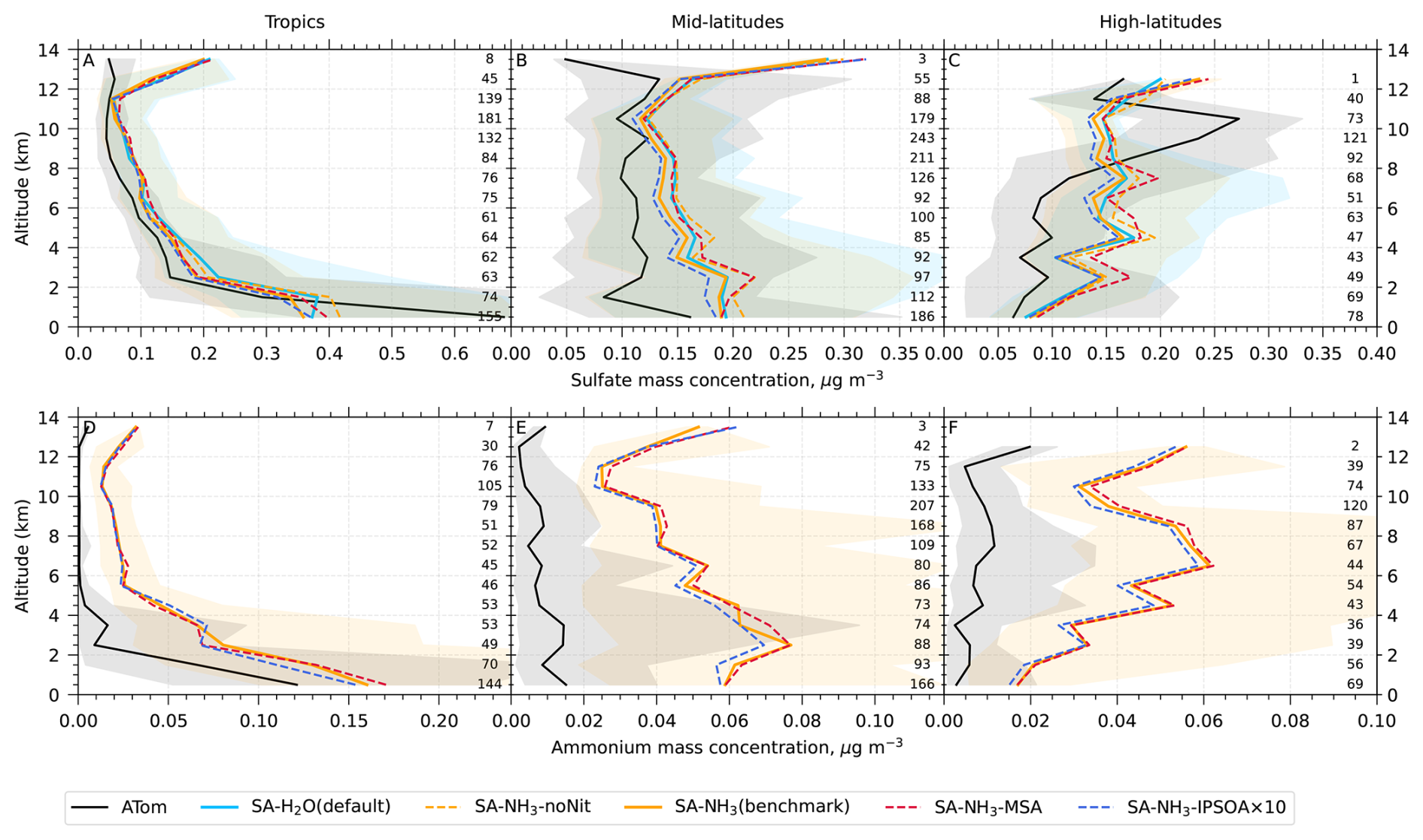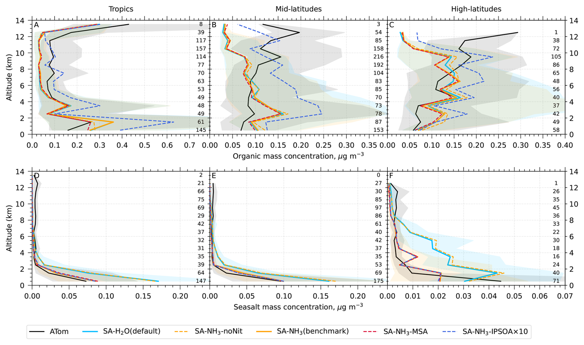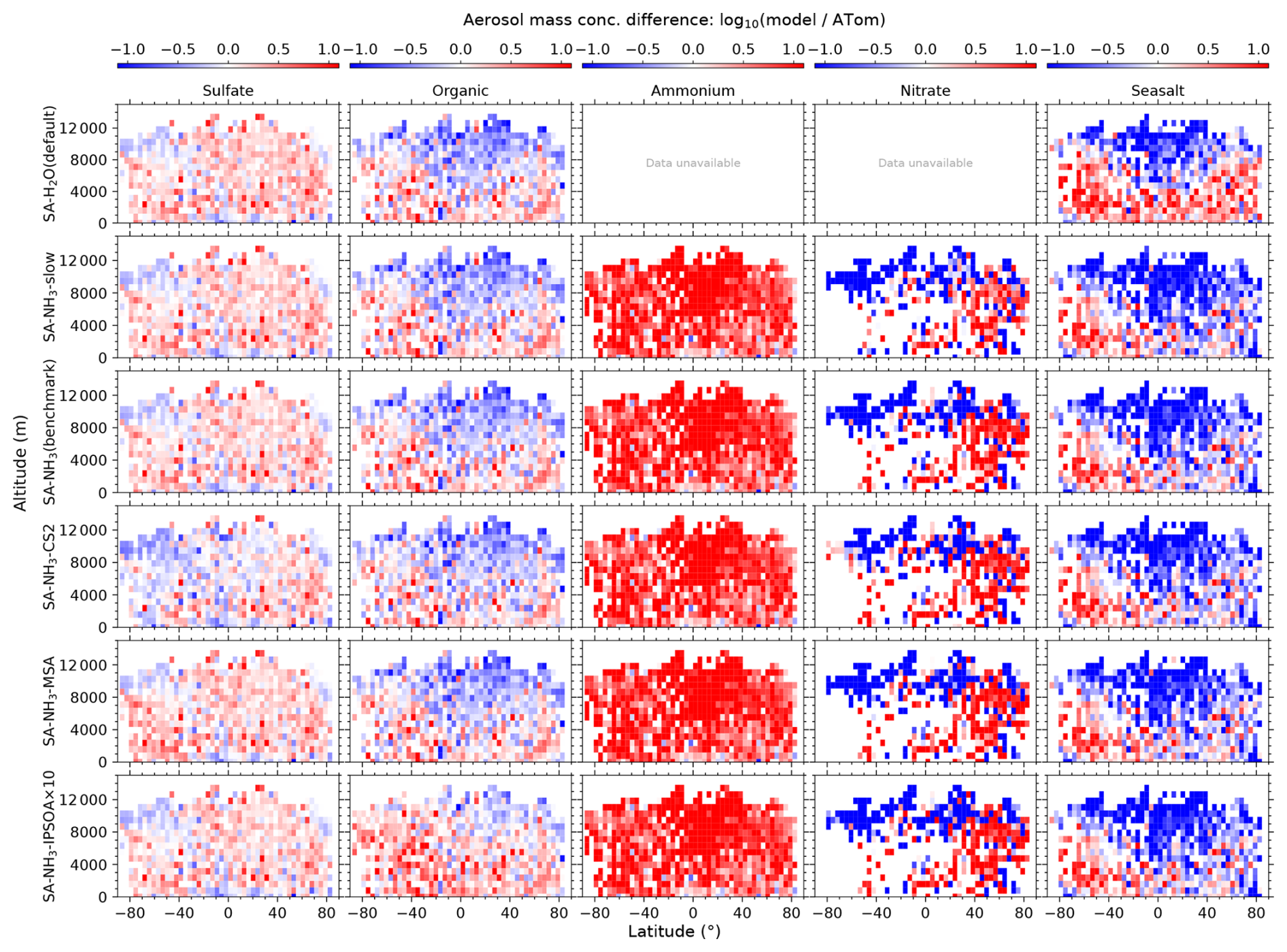 ATom observations have been widely used to evaluate aerosol-related processes in global models. For instance, Koenig et al. (2020) compared CAM-Chem simulations of iodine species with measurements. Froyd et al. (2022) evaluated the performance of CESM/CARMA and GEOS/GOCART in simulating dust aerosols and examined the influence of dust on cirrus cloud formation. Williamson et al. (2019) compared aerosol number size distributions from ATom with outputs from GEOS-Chem, CAM5, and CESM. Yu et al. (2019) assessed the effectiveness of aerosol removal by convective systems in CESM. Hodzic et al. (2020) evaluated the performance of GEOS5, ECHAM6-HAM, CESM, and GEOS-Chem in simulating aerosol chemical composition, with a particular focus on organic aerosols. Nault et al. (2021) analysed the simulated inorganic aerosol acidity in CCSM4, GISS, TM4, GEOS-Chem, GEOS5, and AM4.1 using ATom data. More recently, Gao et al. (2022) provided a detailed comparison of GEOS-Chem simulations with ATom measurements across multiple aerosol species, including sulfate, organics, black carbon, nitrate, and ammonium. Bian et al. (2024) evaluated the performance of AeroCom models in simulating the sulfur cycle over the marine atmosphere. Together, these studies demonstrated the value of ATom data in identifying model biases and highlight the importance of accurately representing aerosol sources, transformations, and removal processes to improve simulations of global aerosol lifecycle.