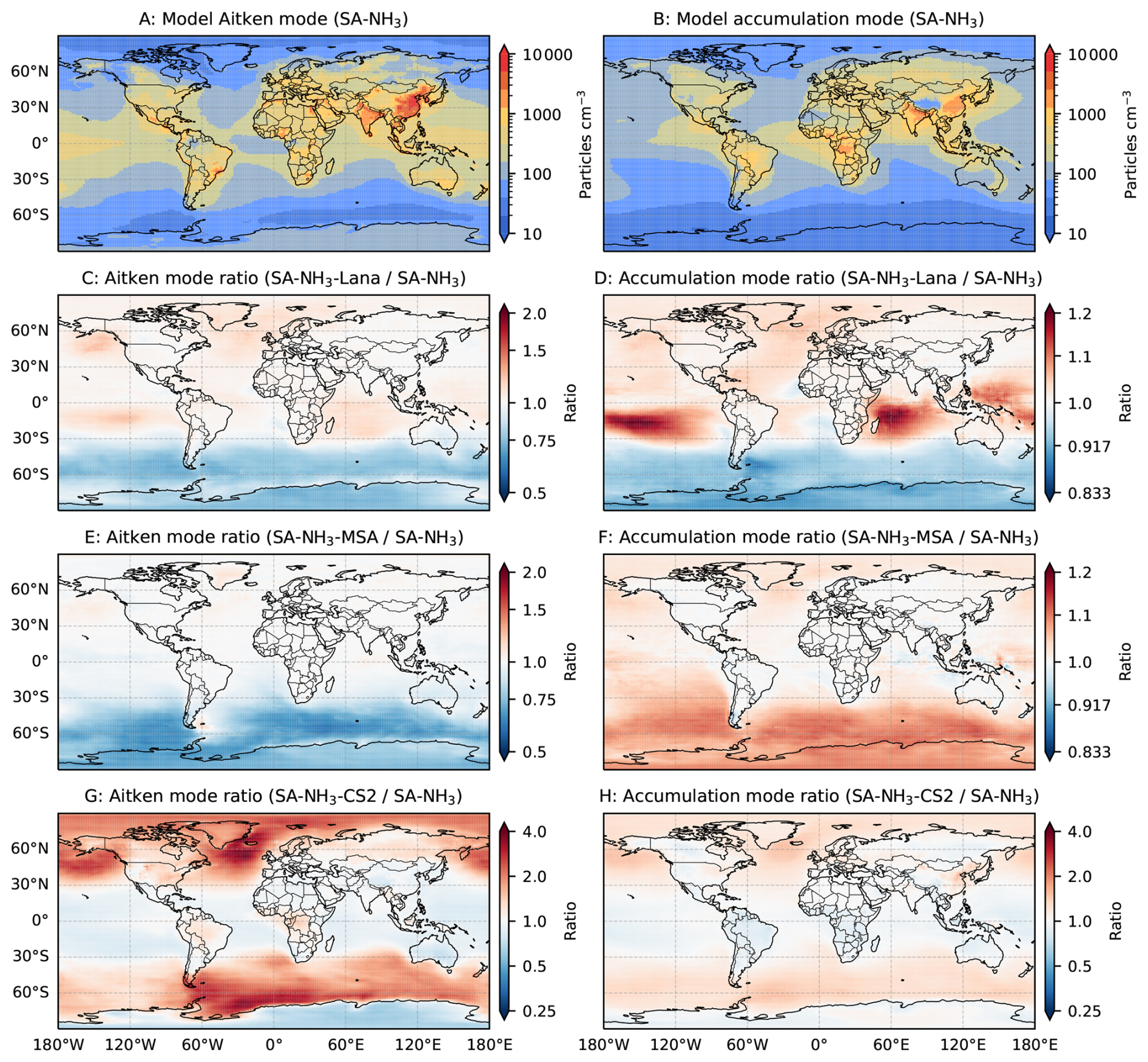 Finally, the MSA condensation scheme implemented assumes irreversible condensation onto pre-existing aerosol particles, at the same rate as H2SO4. This assumption is based on the comparable molecular weights (MSA = 96 g mol−1; H2SO4 = 98 g mol−1) and bulk densities (MSA = 1.5 g cm−3; H2SO4 = 1.8 g cm−3) of the two species. This treatment is supported by recent Arctic observations which suggest that MSA can condense effectively onto pre-existing aerosols, potentially at a rate comparable to that of H2SO4 (Beck et al., 2021). The MSA aerosol mass is currently merged with the existing sulfate aerosol mass in the model for simplicity. The MSA condensation scheme is added to the SA-NH3 (benchmark), hereafter referred to as SA-NH3-MSA.