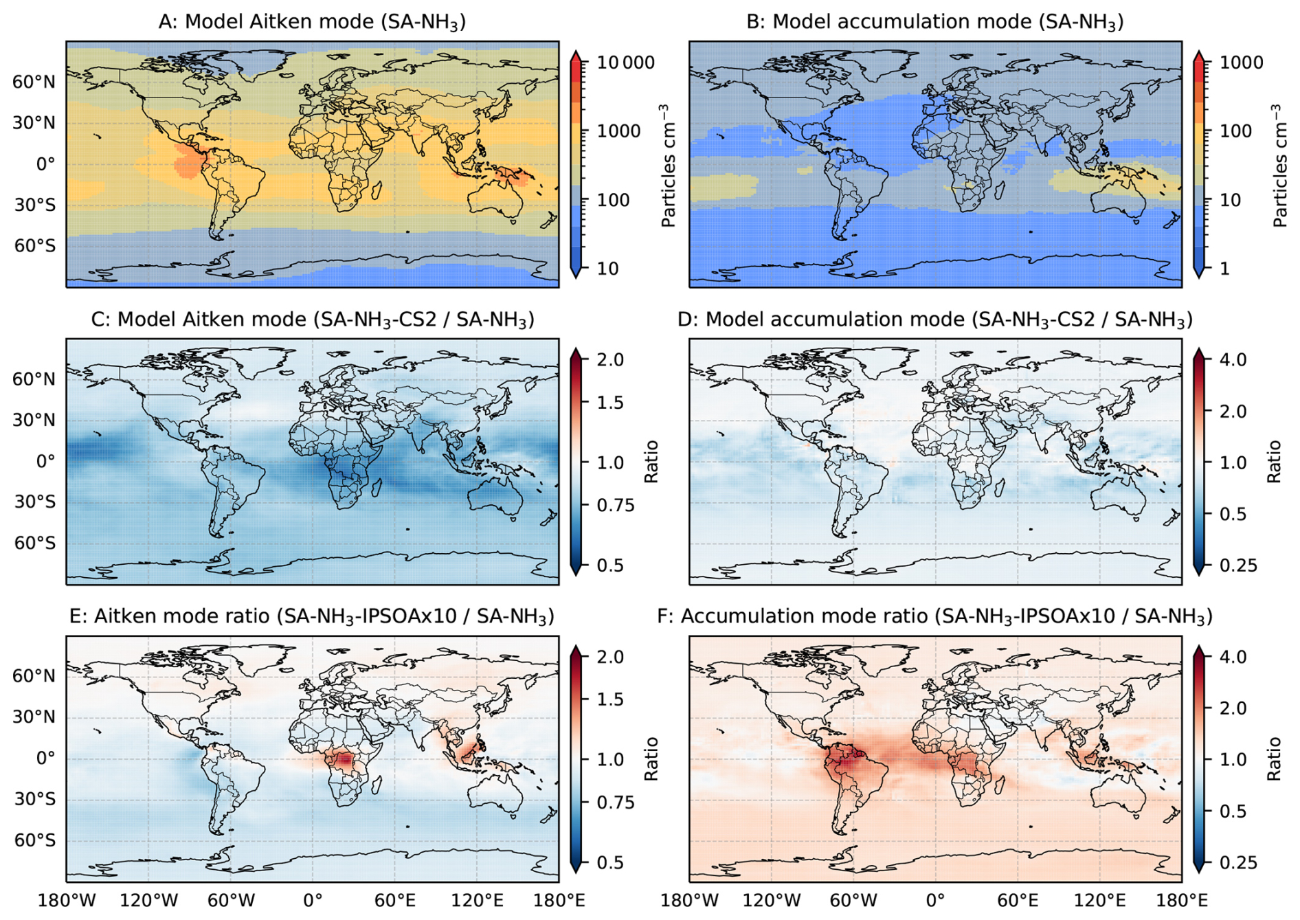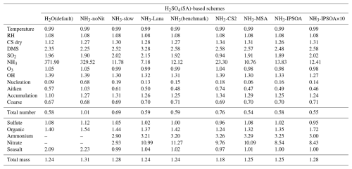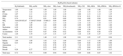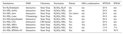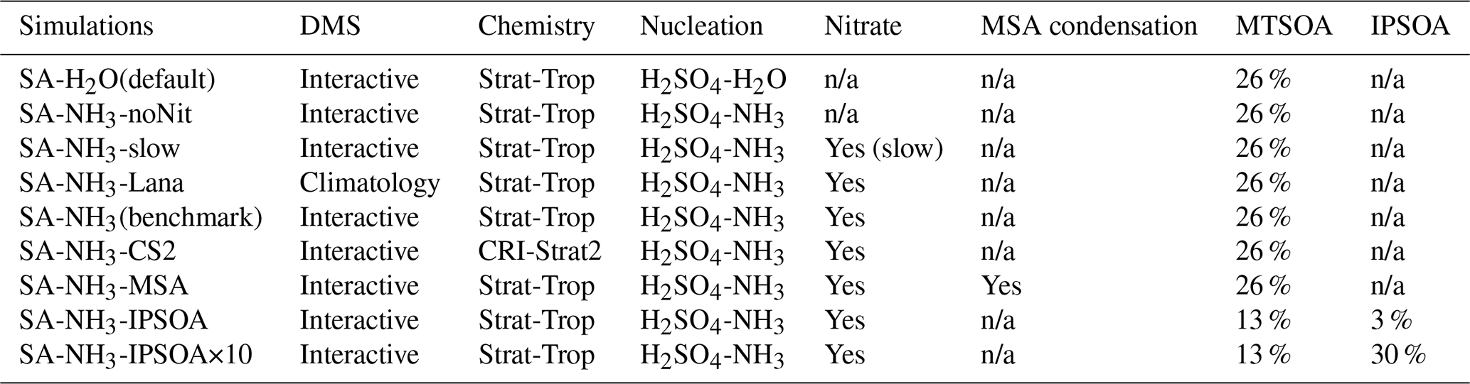 Table 2Summary of model simulations and configurations used in this study. The table shows the key differences between simulations, including DMS emission schemes (interactive vs. climatology), atmospheric chemistry schemes (Strat-Trop vs. CRI-Strat2), aerosol nucleation mechanisms (H2SO4–H2O vs. H2SO4–NH3), inclusion of ammonium nitrate chemistry, methanesulfonic acid (MSA) condensation, and secondary organic aerosol (SOA) formation pathways. MTSOA refers to monoterpene-derived SOA mass yield, while IPSOA refers to isoprene-derived SOA mass yield. The SA-NH3 (benchmark) simulation represents the primary configuration with newly implemented H2SO4–NH3 nucleation scheme and ammonium nitrate scheme used for comparison with other model implementations. Simulation abbreviations (e.g. SA-NH3-IPSOA) are used throughout the manuscript, where SA denotes sulfuric acid to distinguish from the chemical formula notation (e.g. H2SO4–NH3) used for nucleation mechanisms.