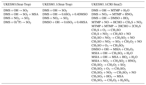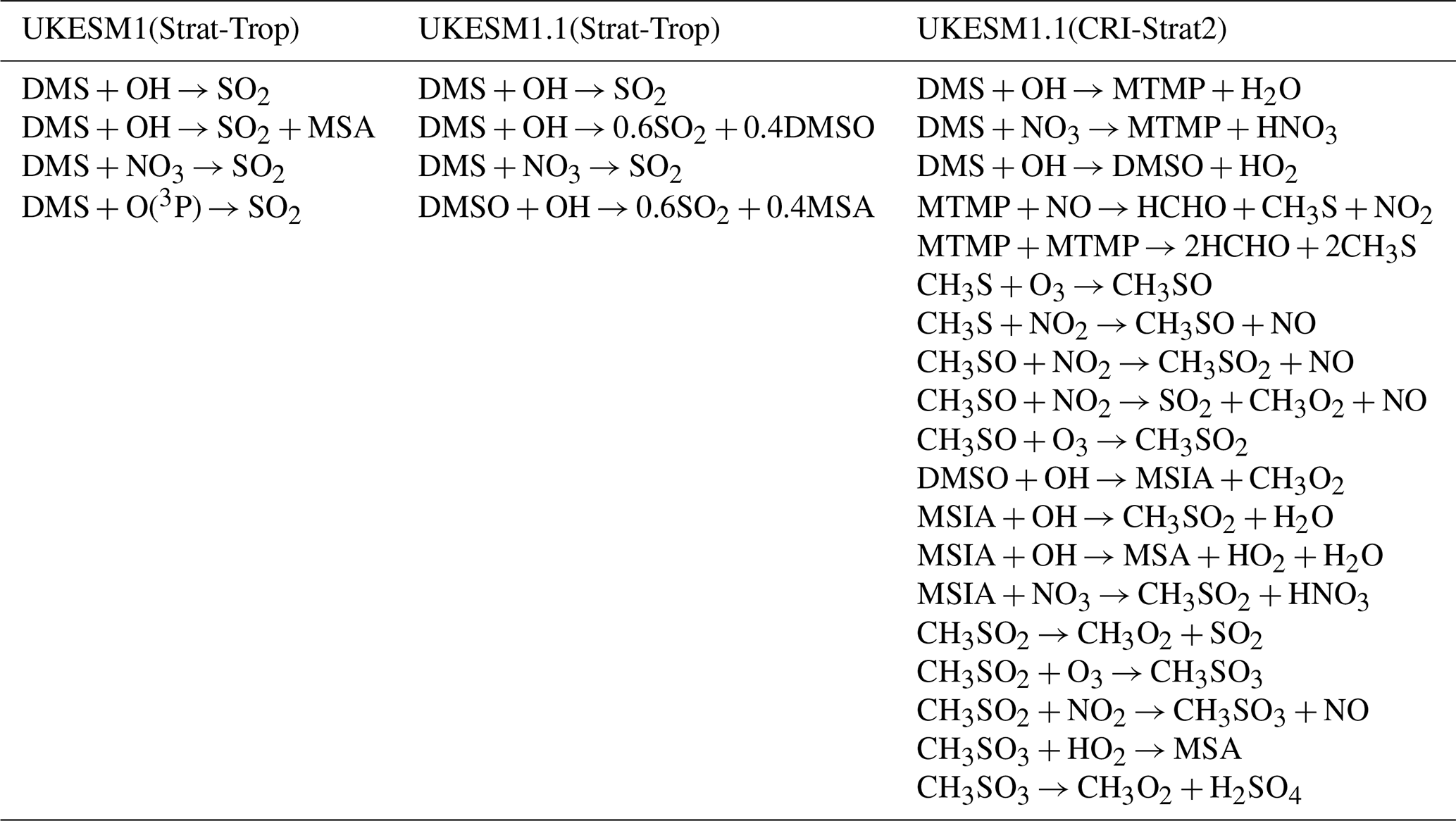 Table 1Comparison of DMS oxidation pathways across different chemistry schemes in UKESM versions. The table shows the key DMS oxidation reactions implemented in UKESM1.0 (Strat-Trop), UKESM1.1 (Strat-Trop), and UKESM1.1 (CRI-Strat2) chemistry schemes. UKESM1.1 incorporates dimethyl sulfoxide (DMSO) as an intermediate species with simplified oxidation pathways, while CRI-Strat2 includes a more detailed representation with methylthiomethylperoxy radical (MTMP) and methylsulfinic acid (MSIA) intermediates leading to both SO2 and MSA formation. The numerical coefficients indicate stoichiometric yields for branching reactions. We note that while Mulcahy et al. (2023) suggested that the UKESM1.1 included DMS + O(3P) → SO2, it is not included in the version of UKESM1.1 used in this study.