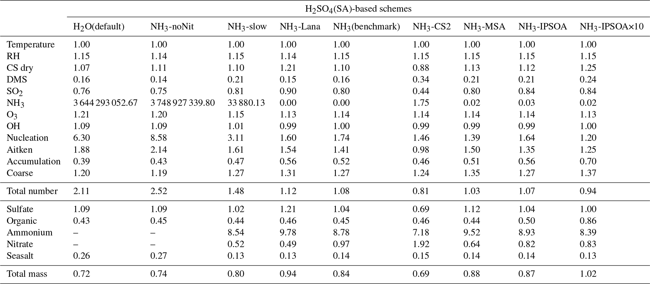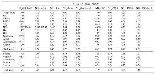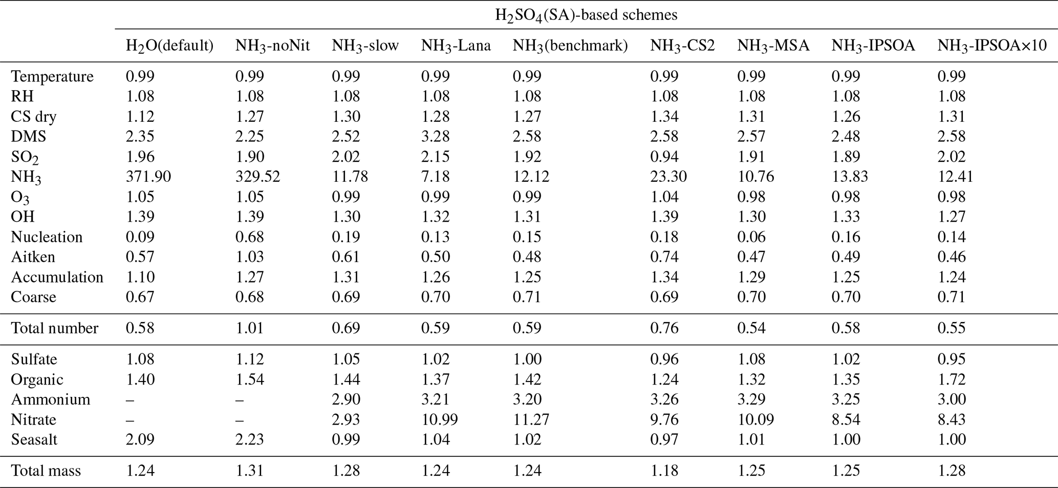 The new H2SO4–NH3 nucleation scheme is implemented in all simulations listed in Table 2, except for the control simulation using the default binary scheme, labelled SA–H2O(default). The SA-NH3(benchmark) simulation represents a key experiment in this study; it incorporates the ammonium nitrate scheme using parameter settings corresponding to the fast nitrate formation scheme (specifically, a nitric acid uptake coefficient γ = 0.193) as described by Jones et al. (2021). Another sensitivity simulation, SA-NH3-slow, explores slower nitrate formation by utilising γ = 0.001. Additionally, the SA-NH3-noNit simulation is performed using the H2SO4–NH3 nucleation scheme but without activating the ammonium nitrate module, serving as a reference to evaluate the impact of the nitrate scheme itself on aerosol formation.