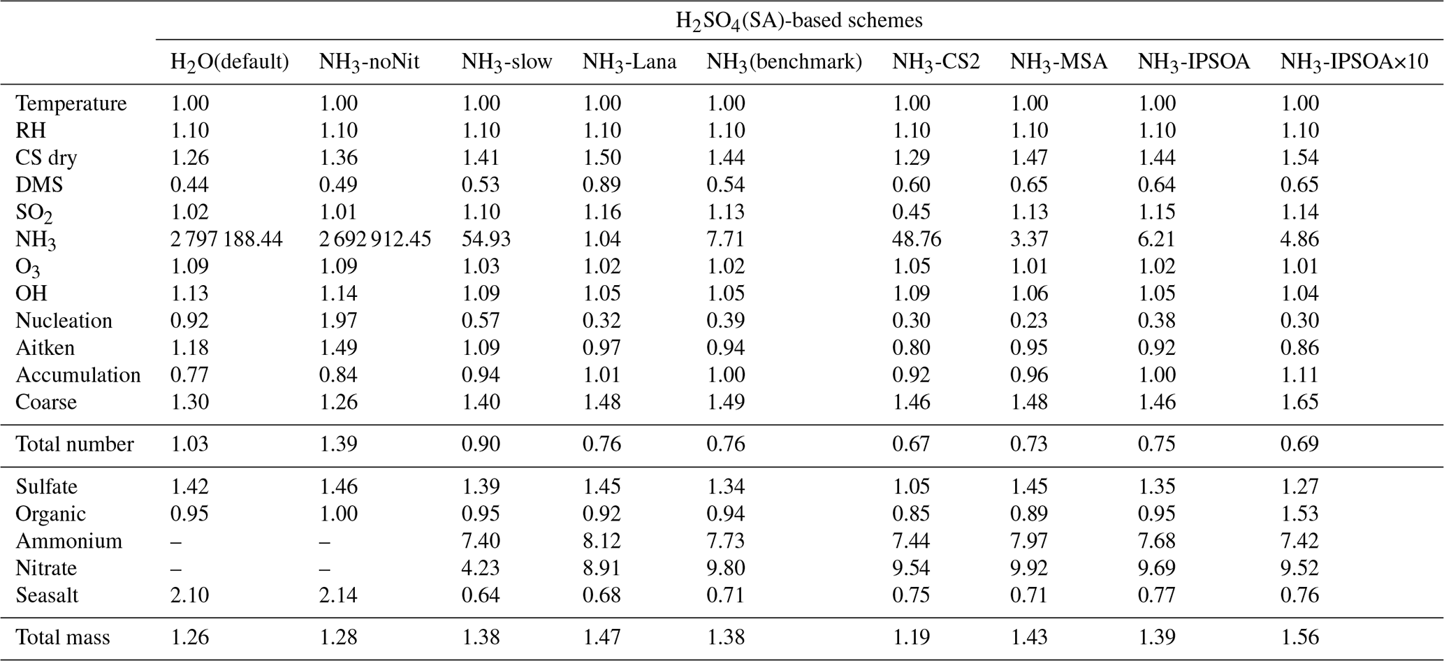 The key reaction pathways of the DMS oxidation within the CS2 version used in this study are tabulated in Table 1. Similarly to other sensitivity simulations, the CS2 scheme is coupled with the H2SO4–NH3 nucleation scheme and the ammonium nitrate scheme, which is labelled SA-NH3-CS2. It is important to note, however, that despite providing an improved representation compared to Strat-Trop, the key DMS oxidation pathways included in CS2 (primarily following those described by Von Glasow and Crutzen, 2004) do not reflect the latest scientific understanding (Cala et al., 2023). Numerous recent studies, emerging from theoretical, laboratory experiments, and field observations, have provided a more comprehensive picture of DMS oxidation mechanisms (Veres et al., 2020; Shen et al., 2022; Jacob et al., 2024). However, incorporating these more up-to-date reaction pathways into the model is beyond the scope of this study. The primary purpose of this simulation is therefore to evaluate how employing a different, more complex tropospheric chemistry scheme (CS2 vs. Strat-Trop) influences the simulated atmospheric sulfur cycle, the resultant aerosol number size distributions and composition.